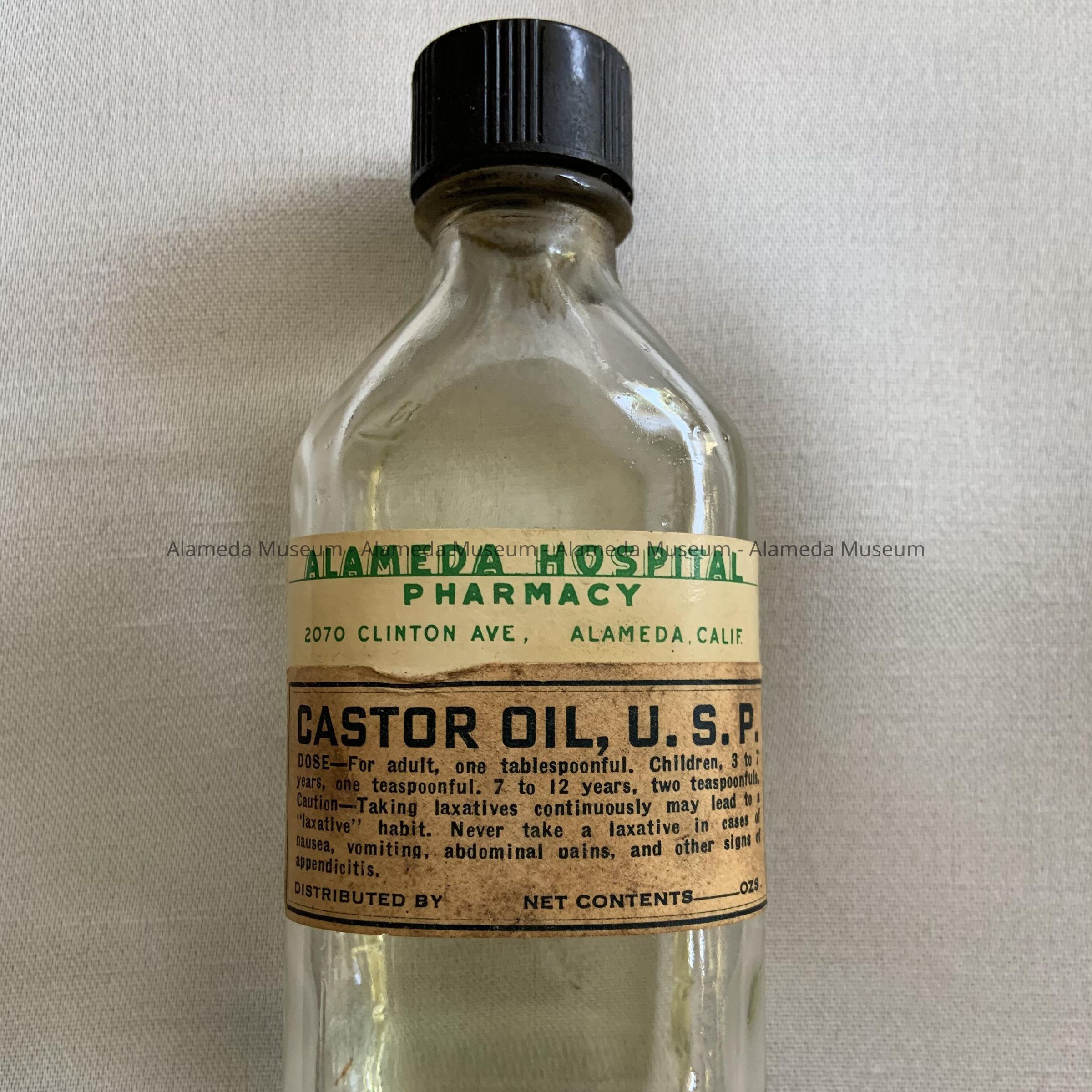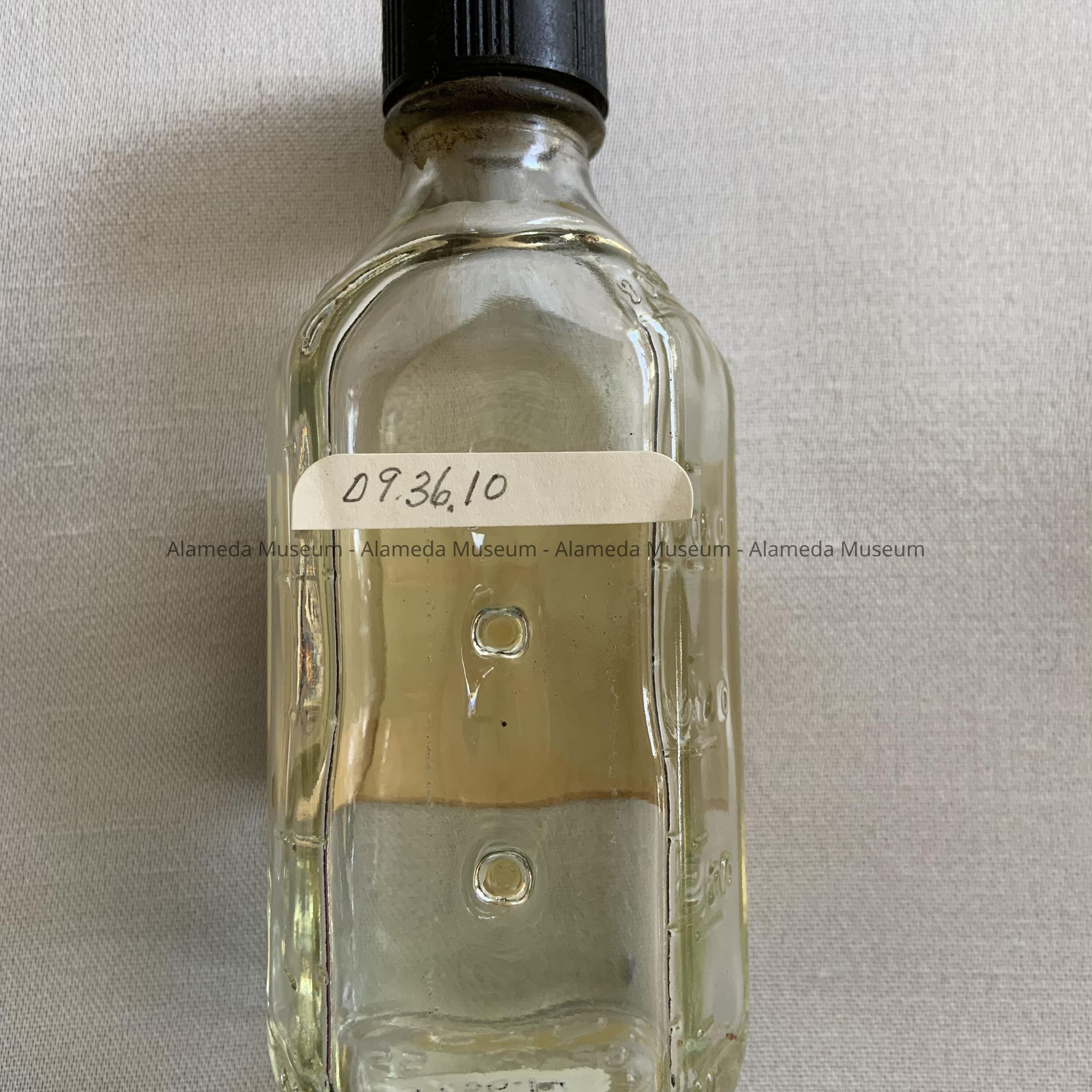 DESCRIPTION: A DOUBLE-SEAM, CLEAR GLASS MEDICINE BOTTLE WITH ATTACHED PAPER LABEL. LABEL HAS BOLD-PRINTED CAPTION, "ALAMEDA HOSPITAL PHARMACY, 2070 CLINTON AVENUE, ALAMEDA."