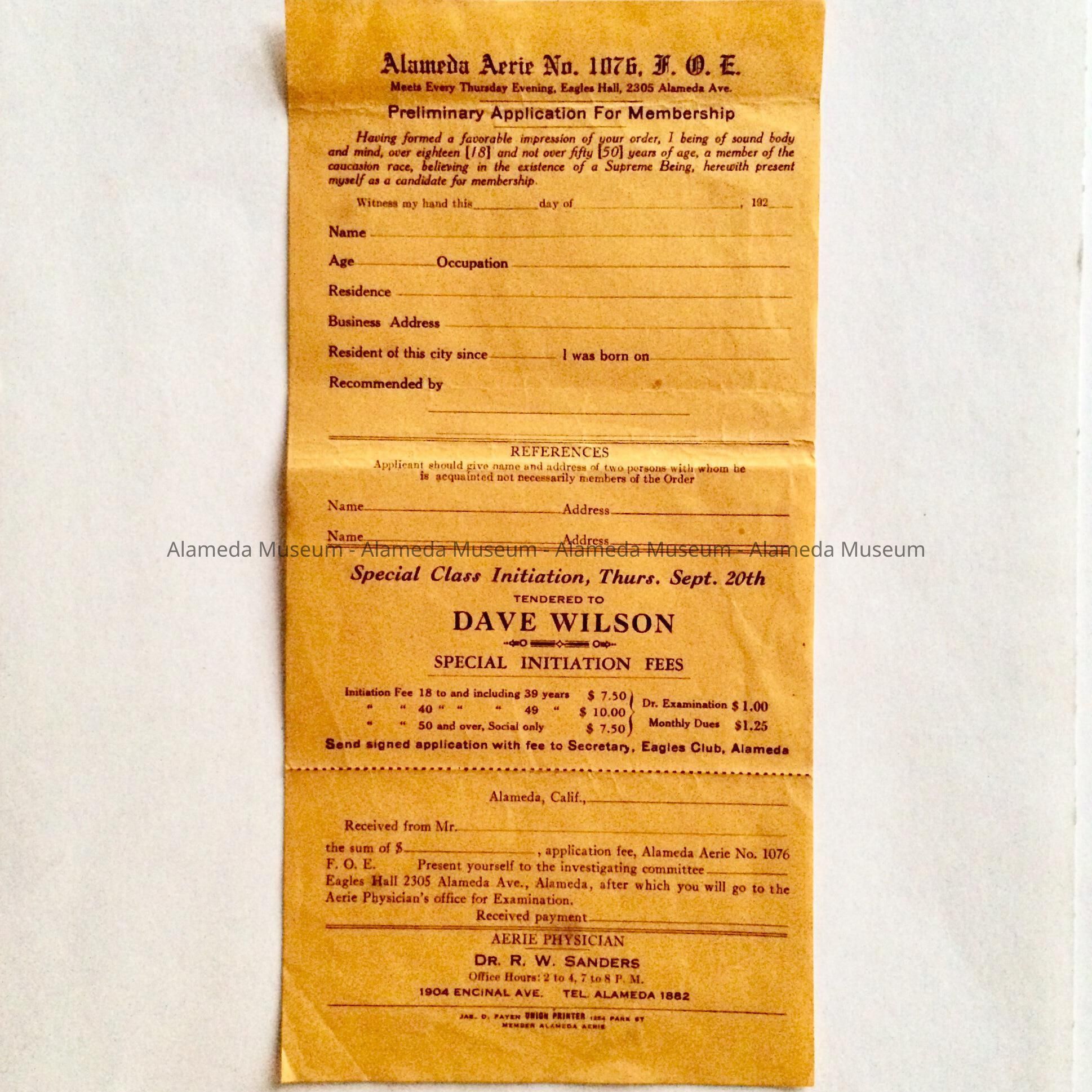 Membership application Form, Alameda Aerie No. 1076, Eagles, 1920sEntry/Object ID