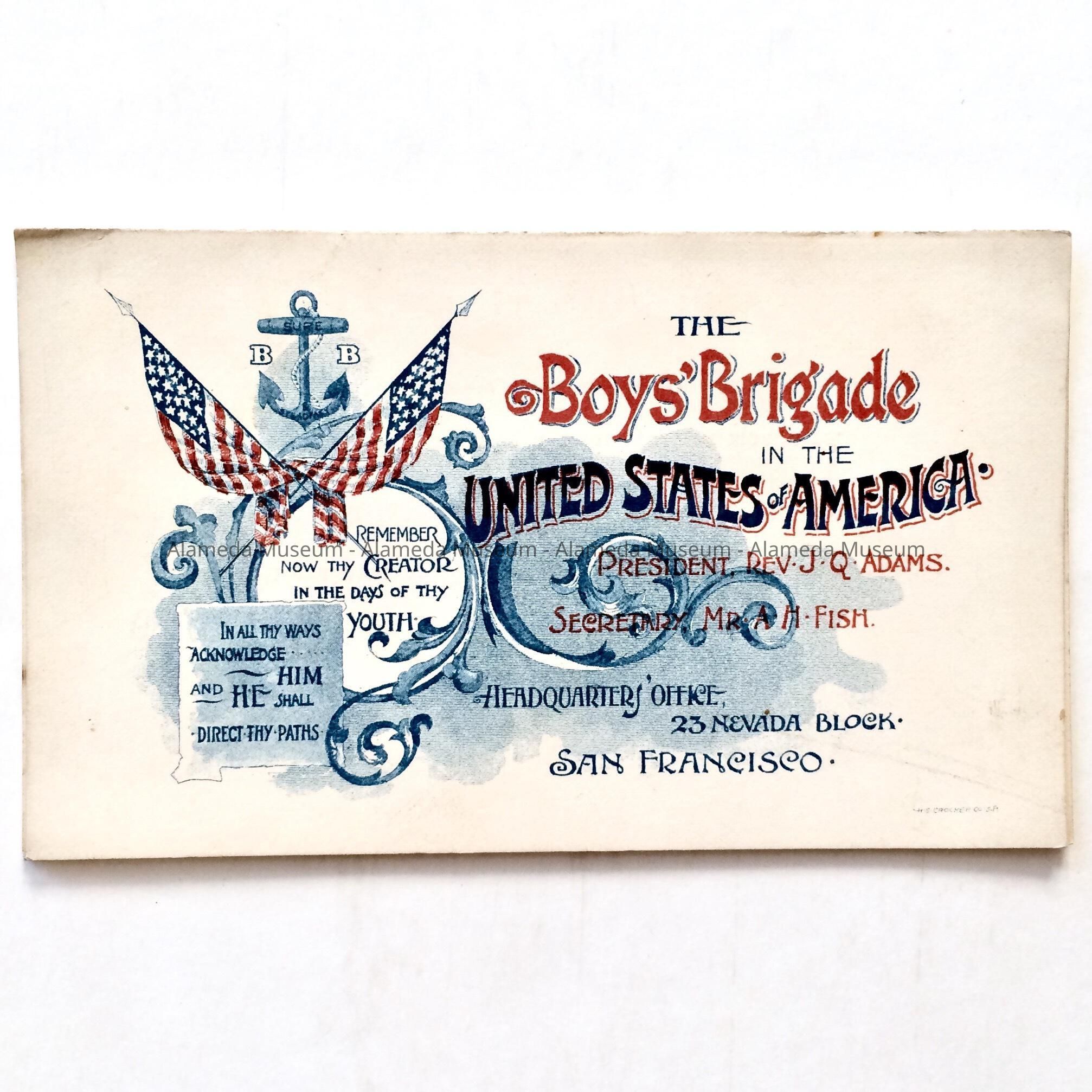 TWO- PAGE BOOKLET-TYPE MEMBERSHIP CARD, WITH COVER DESIGN FEATURING AMERICAN FLAGS; IN BOLD-PRINTED CAPTION, "THE BOYS' BRIGADE IN THE UNITED STATES OF AMERICA," IN BLUE- AND RED-COLORED TYPE.
