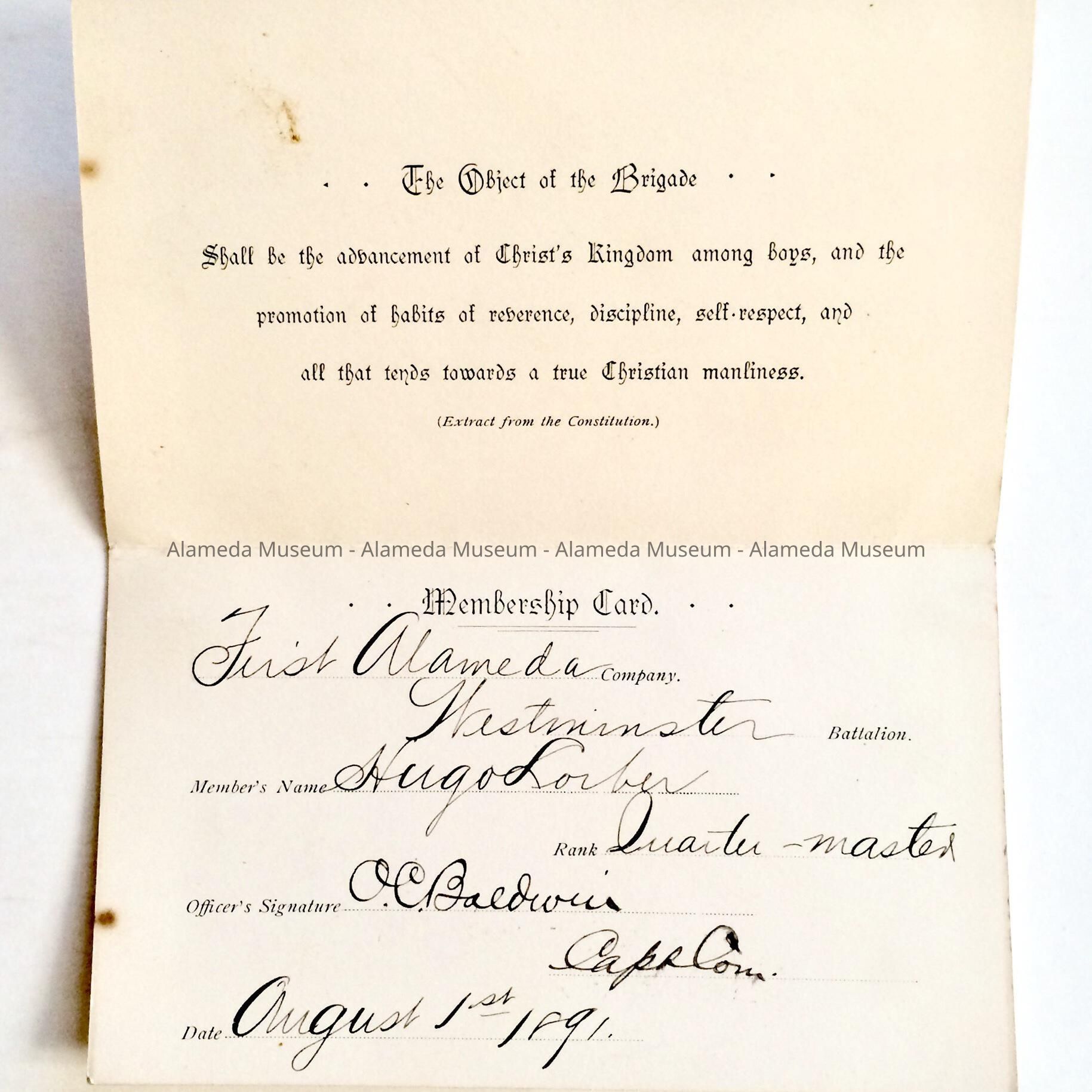MEMBERSHIP CARD TO THE FIRST ALAMEDA COMPANY, WESTMINSTER BATTALION (BN), FOR HUGO LORBER, TO THE BOYS' BRIGADE WHICH WAS AFFILIATED WITH THE FIRST PRESBYTERIAN CHURCH.