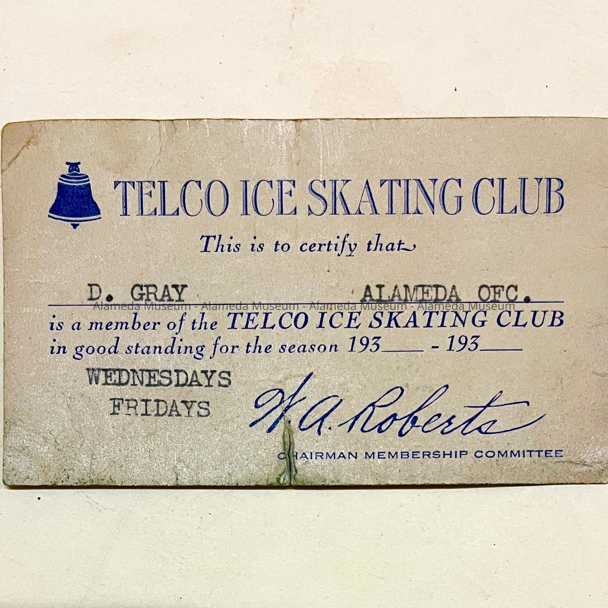 Description: A card, printed in navy blue type on grey, stating ‘Telco Ice Skating Club’. Name (D. Gray), department (‘Alameda Ofc’), and days (Wednesdays and Fridays) are filled in in black by typewriter; card is signed W.A. Roberts.
