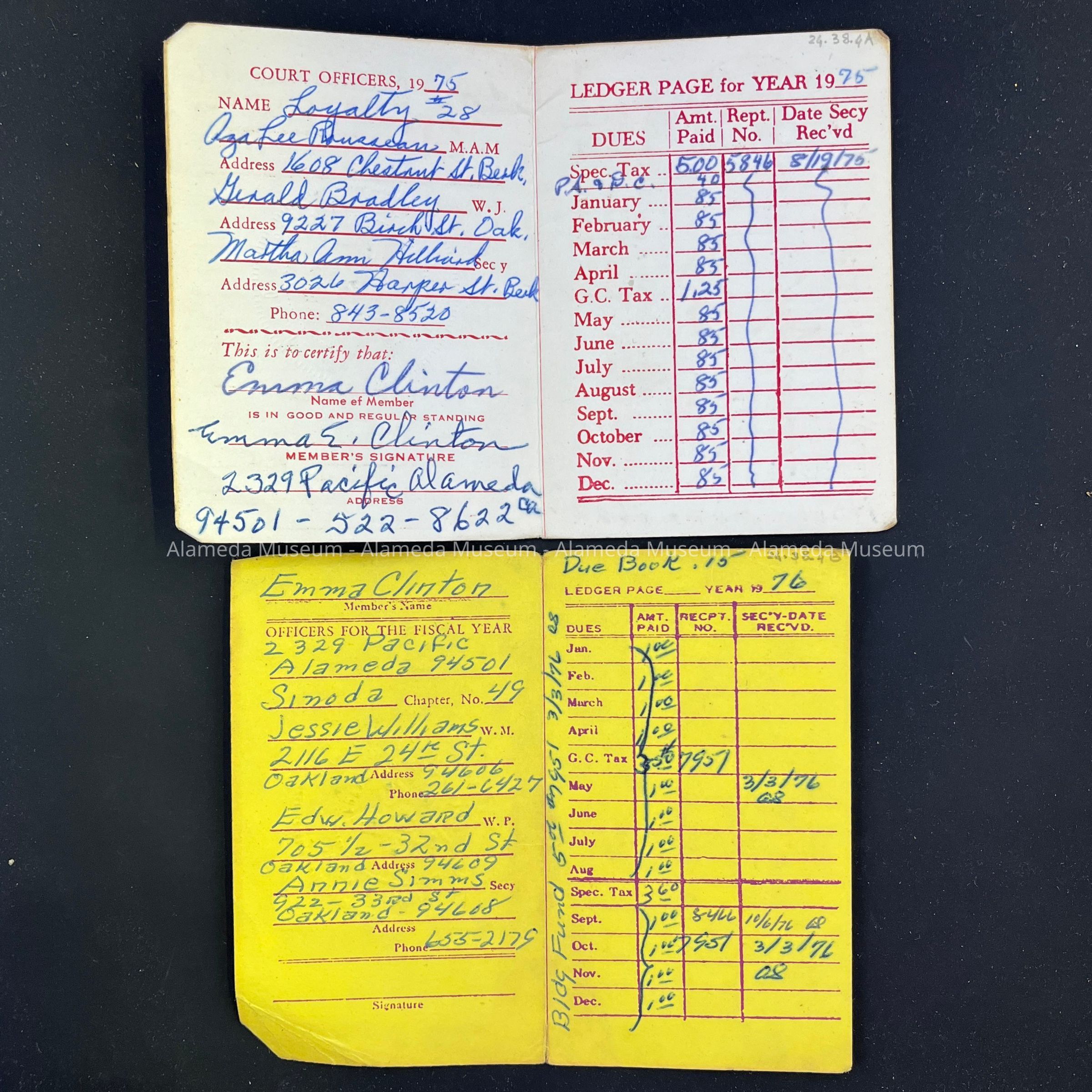 History of Object: membership cards of social organizations, of Emma Clinton, of 2329 Pacific Ave, Alameda. A: Court of Heroines of Jericho, Berkeley, 1975; B. Sinoda 49 of the Eastern Star, Oakland, 1976. Emma came to Alameda from Mississippi and continued in Alameda after the death of her husband. She died in 1977.