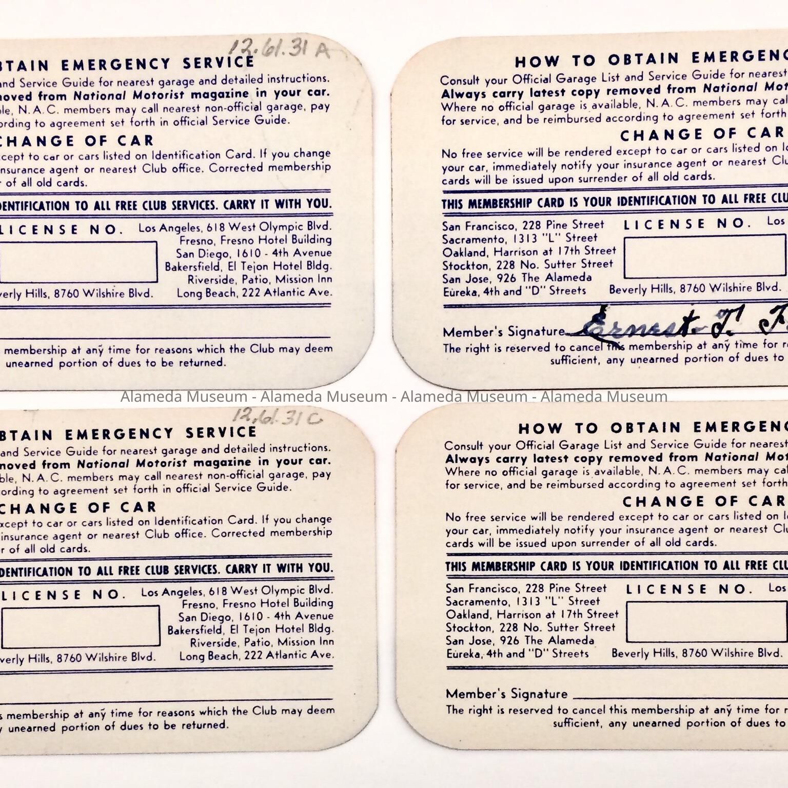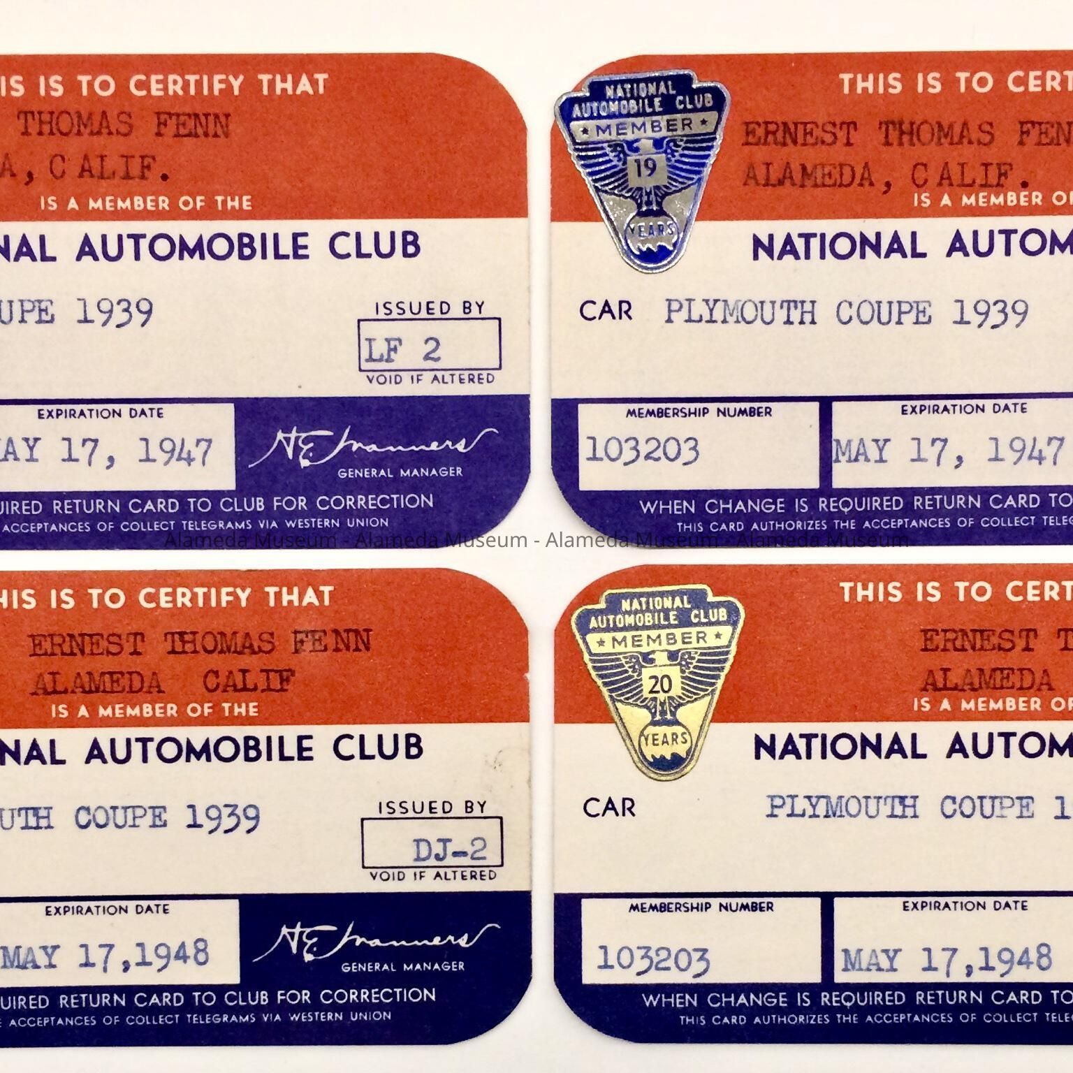 HISTORY OF OBJECTS: MEMBERSHIP CARDS TO THE NATIONAL AUTOMOBILE CLUB ISSUED TO ERNEST THOMAS FENN FOR 1947 AND 1948.