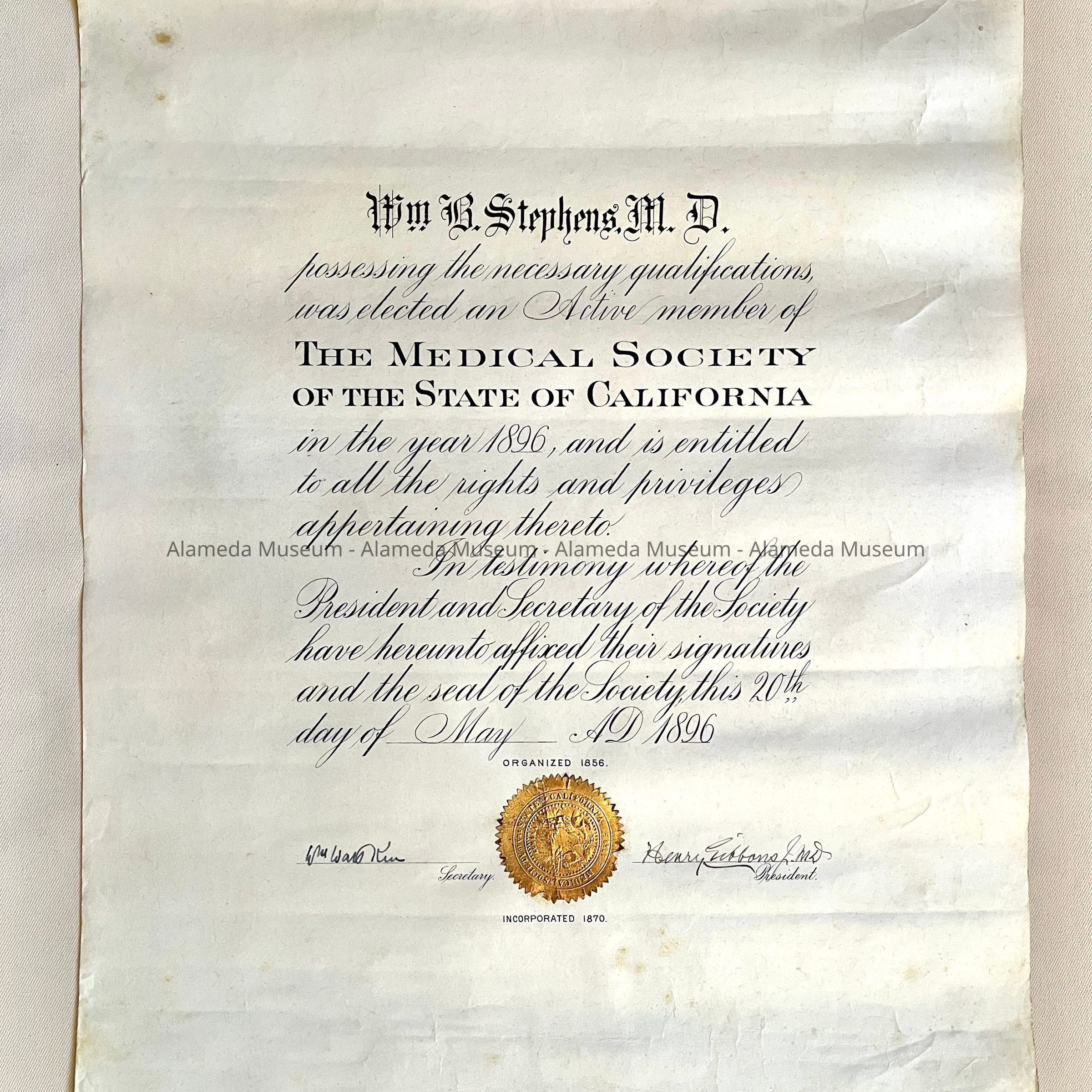 A CERTIFICATE AWARDED TO WILLIAM B STEPHENS, MD, AS AN ACTIVE MEMBER OF THE MEDICAL SOCIETY OF THE STATE OF CALIFORNIA, DATED MAY 20, 1896. DR AND MRS STEPHENS WERE LONGTIME RESIDENTS OF ALAMEDA. DR STEPHENS WAS A PROMINENT MEMBER OF THE ALAMEDA HISTORICAL SOCIETY.