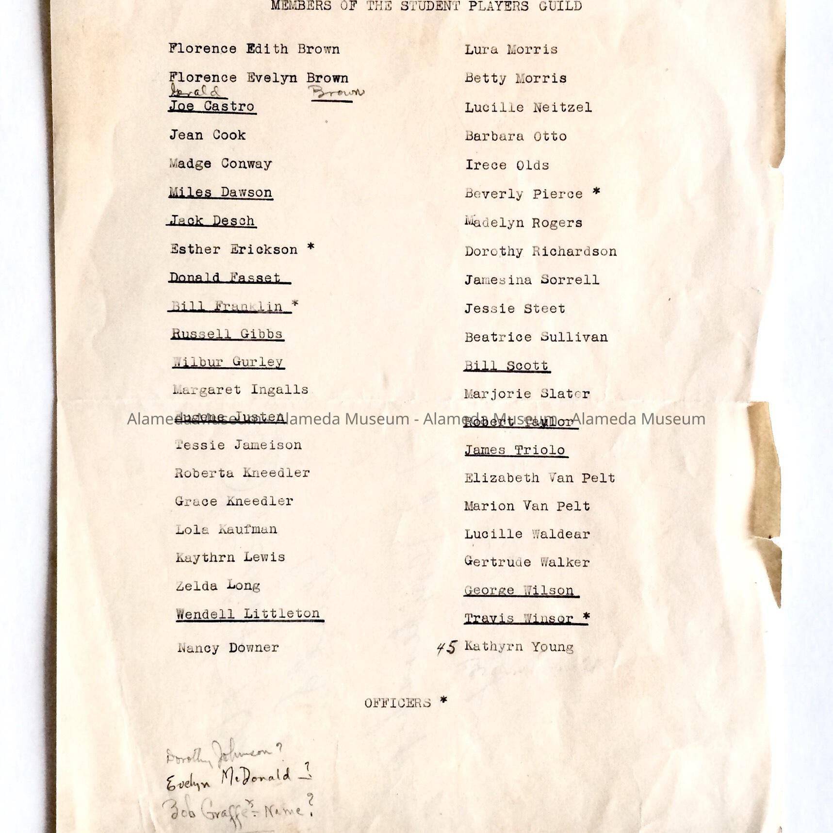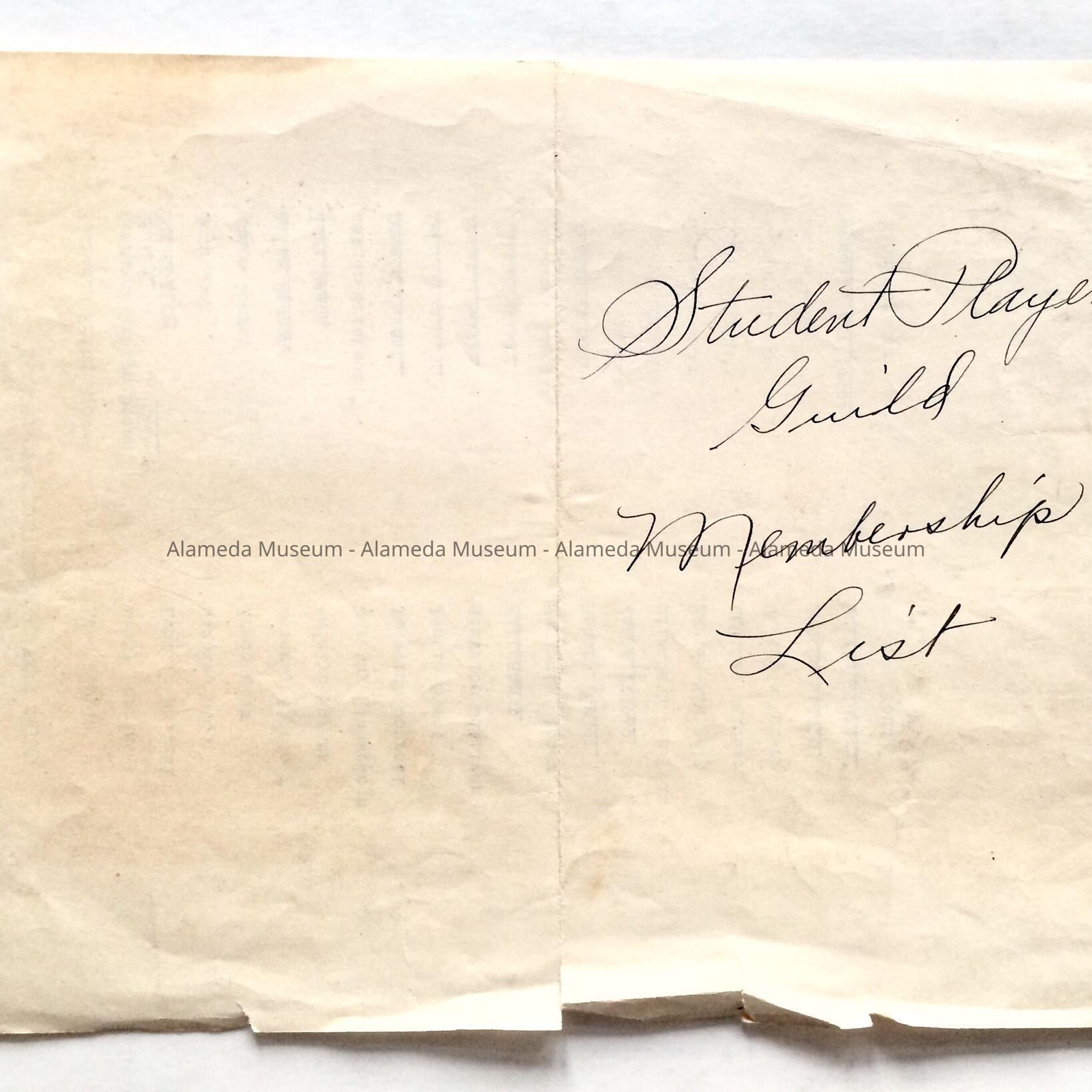 HISTORY OF OBJECT: LIST CONTAINING MEMBERS OF THE STUDENT PLAYERS GUILD, ALAMEDA HIGH SCHOOL