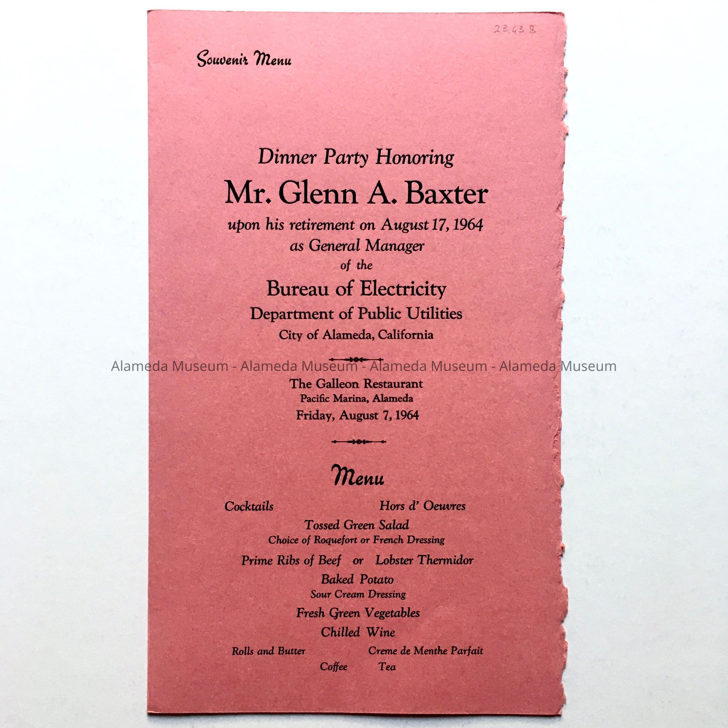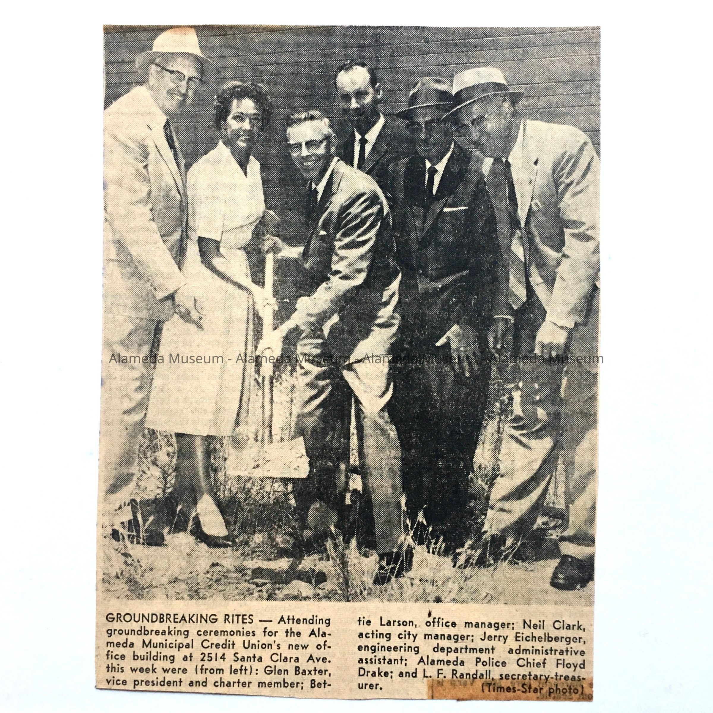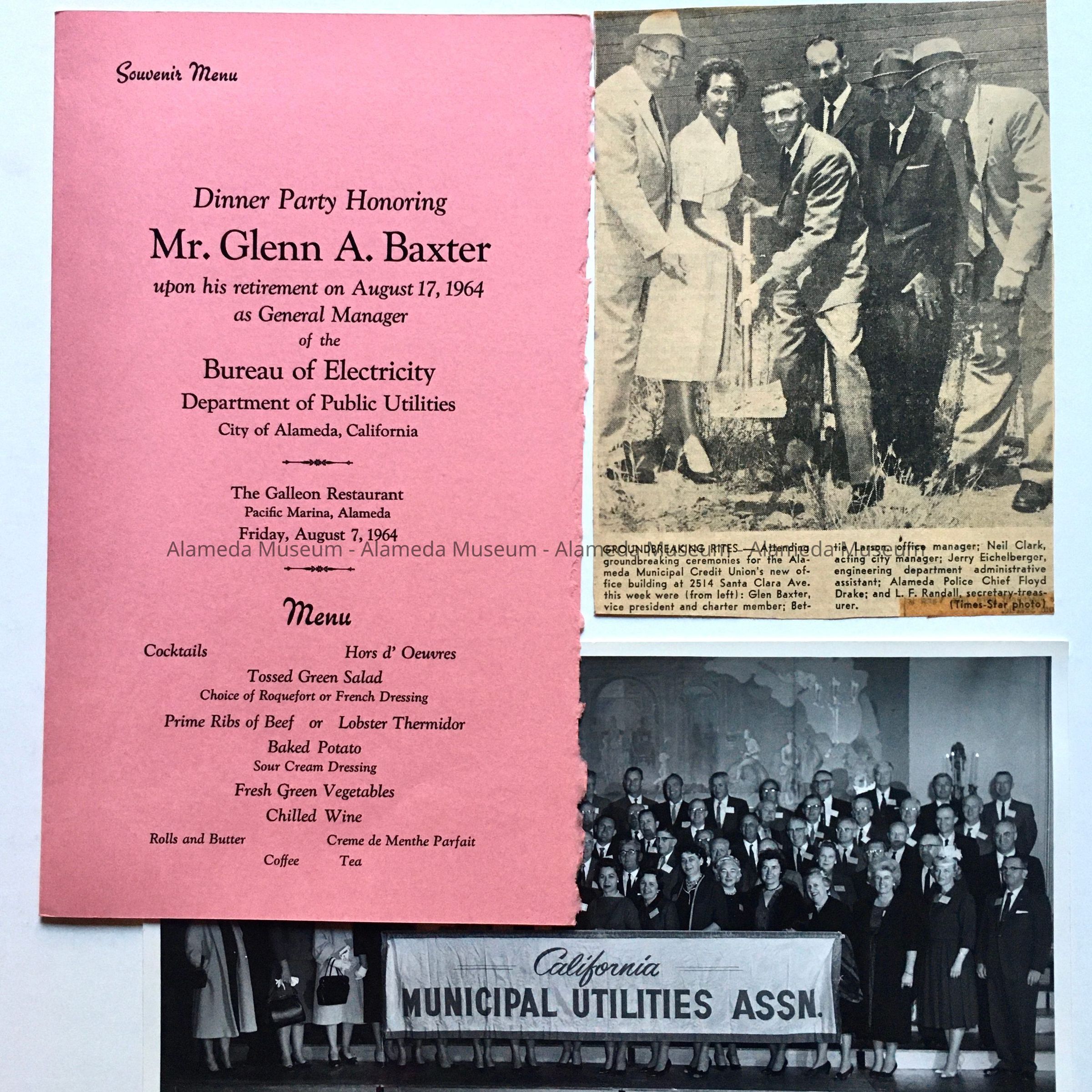 History of Object: Three pieces of memorabilia relating to Glenn Baxter during his tenure as General Manager of the Bureau of Electricity (1951-1964): A. a souvenir menu for dinner held on August 7, 1964, at the Galleon, Pacific Marina, upon his retirement as General Manager of the Bureau of Electricity, with a list of accomplishments and events from his hiring date, September 23, 1931. B. is a clipping of groundbreaking for an office building for the Municipal Credit Union at 2514 Santa Clara (after 1986 office of Jan Mason's OMM, currently offices of Cerda-Zein). C. is a photo taken at a conference attended by Bureau of Electricity staff.