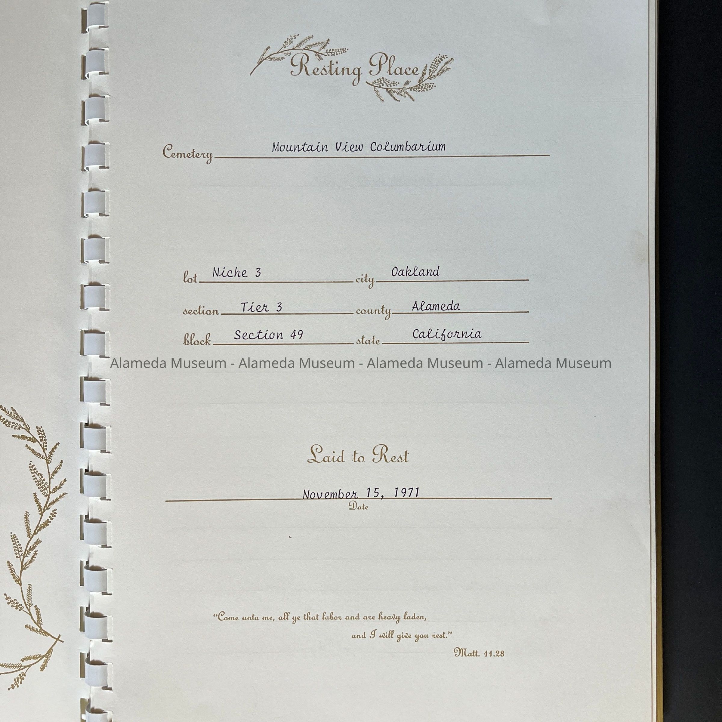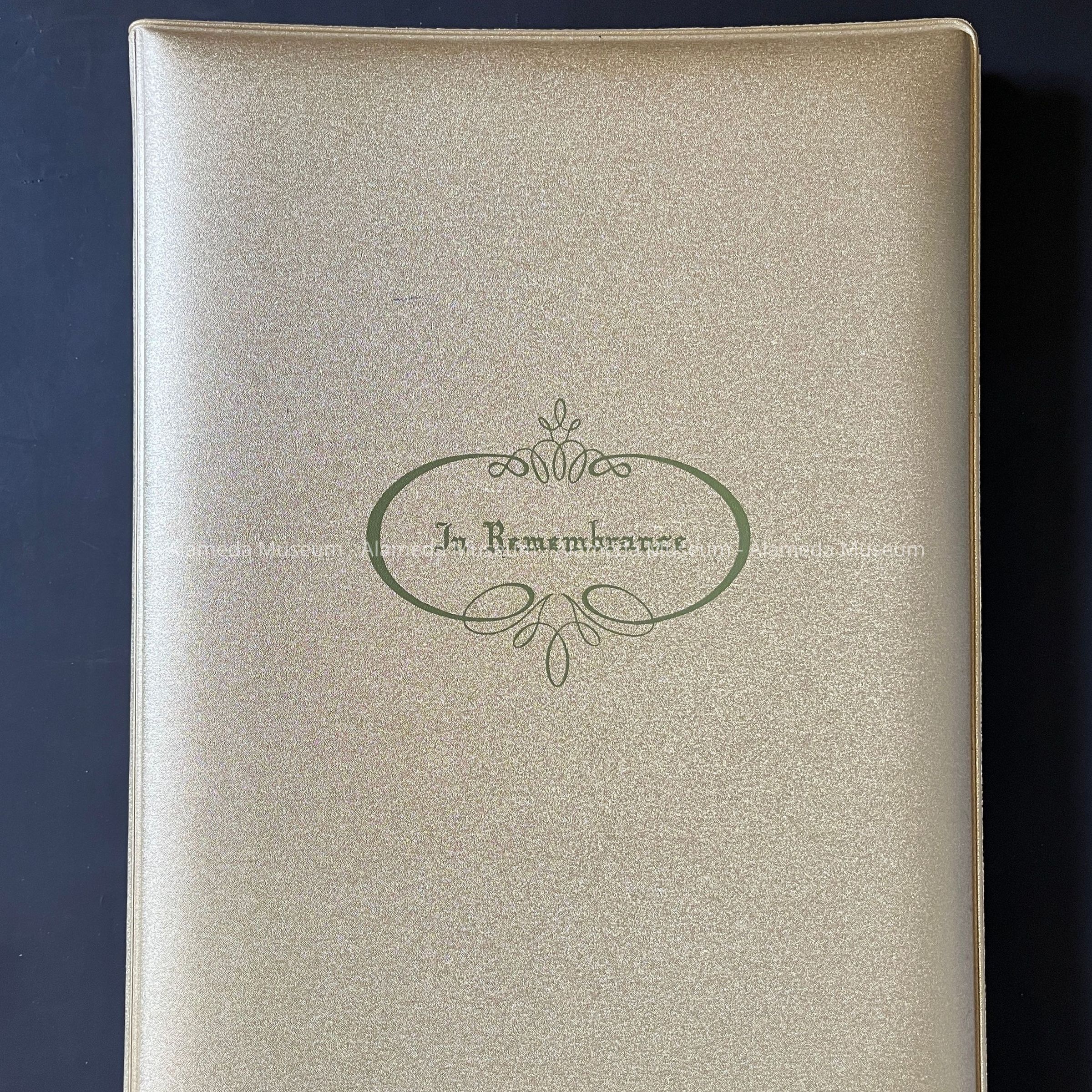 DESCRIPTION: A LOOSE-LEAF BOOK WITH GOLD COLORED PLASTIC COVER THAT HAS A PRINTED MESSAGE, "IN REMEMBRANCE," IN GREEN COLORED TYPE. ACCOMPANYING THE BOOK IS A SHEET OF PAPER WITH NEWSPAPER CLIPPINGS FROM THE SAN FRANCISCO CHRONICLE, OAKLAND TRIBUNE, AND ALAMEDA TIMES-STAR.