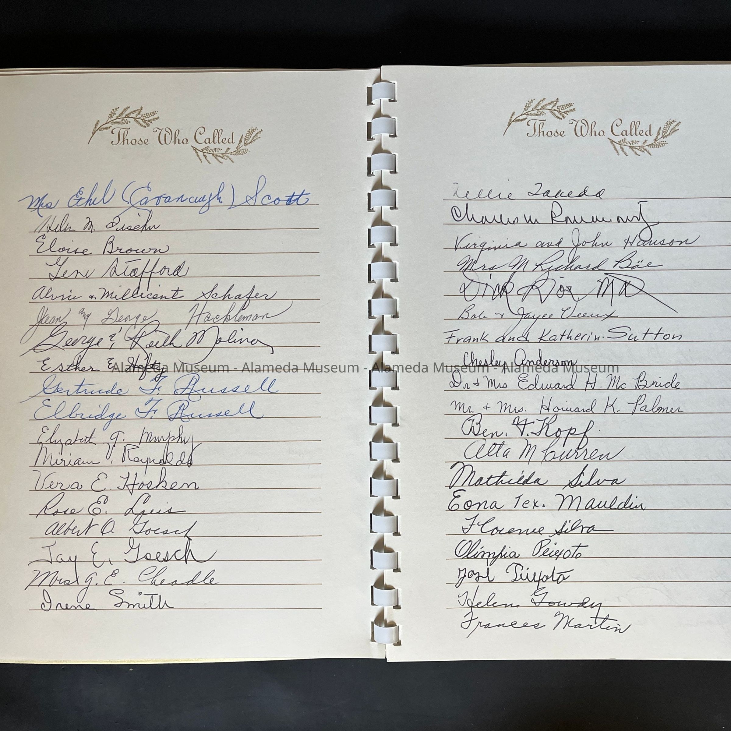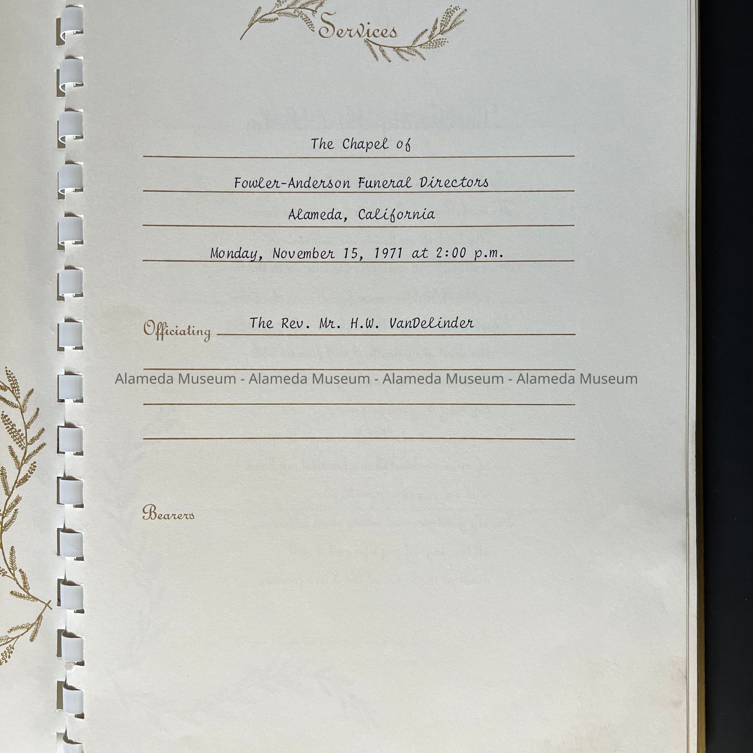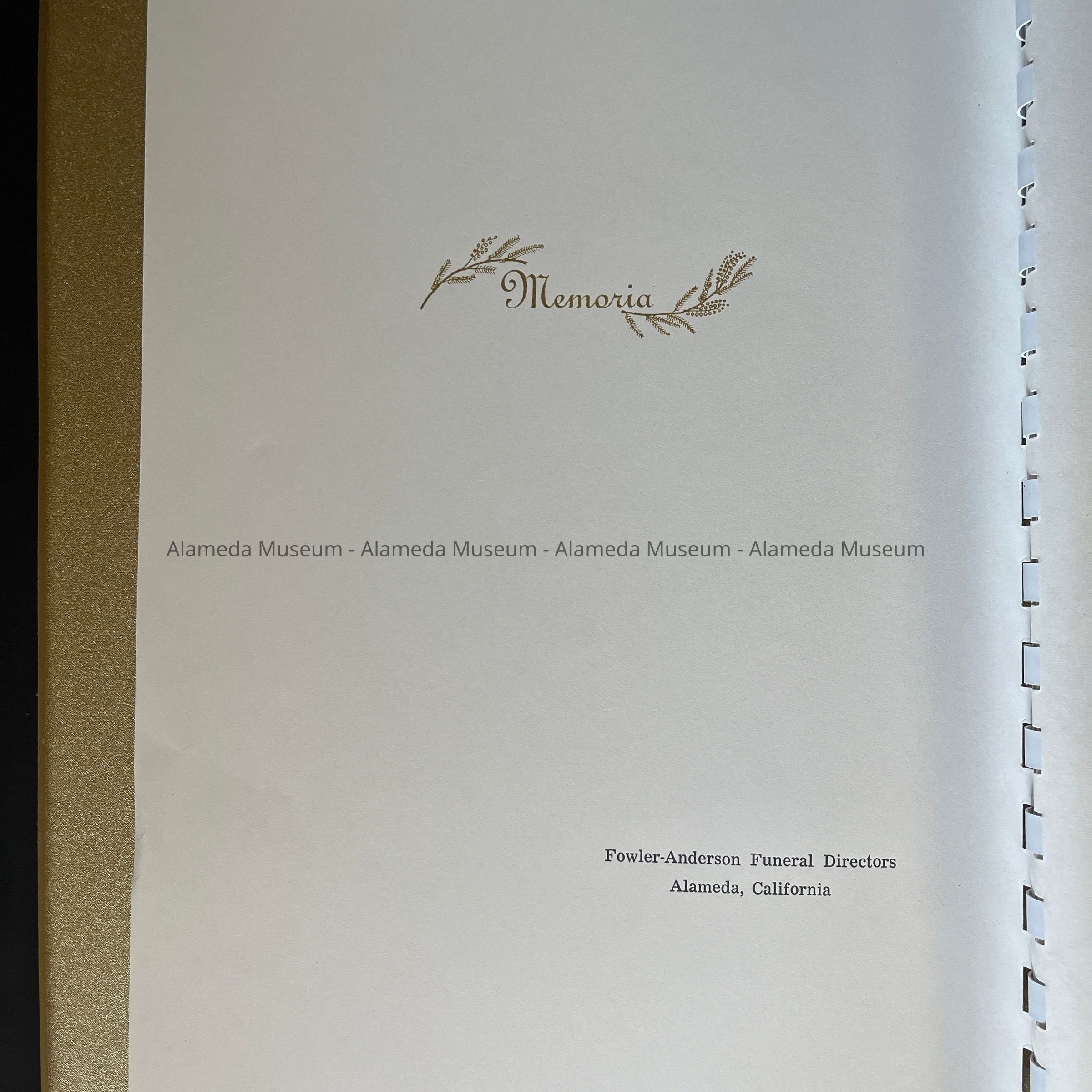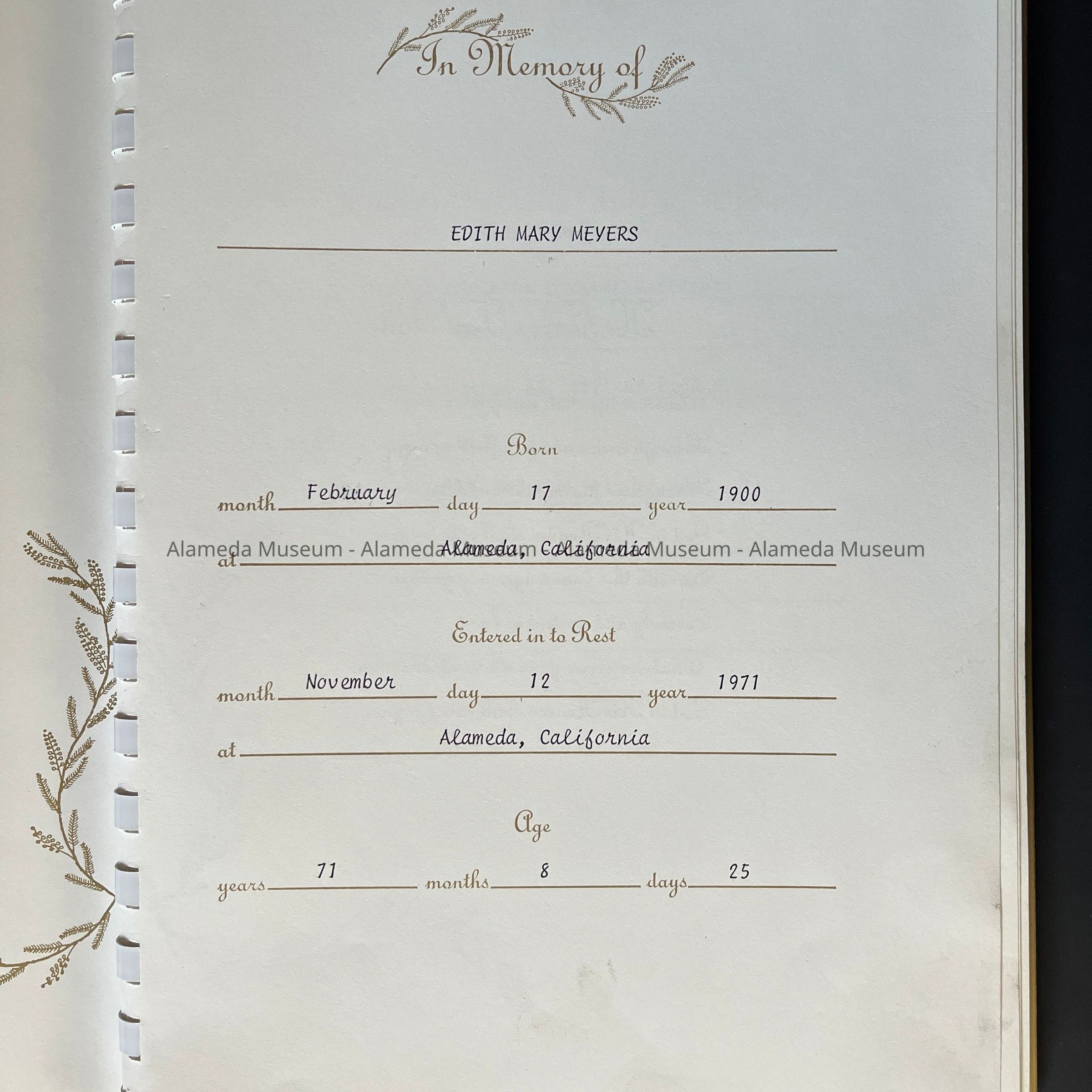 HISTORY OF OBJECTS: A MEMORIAL BOOK FROM FOWLER-ANDERSON FUNERAL PARLOR, 2200 BLOCK OF SANTA CLARA AVENUE, ALAMEDA. THE BOOK HONORED THE LATE EDITH MARY MEYERS, FEBRUARY 2, 1900 TO NOVEMBER 12, 1971.