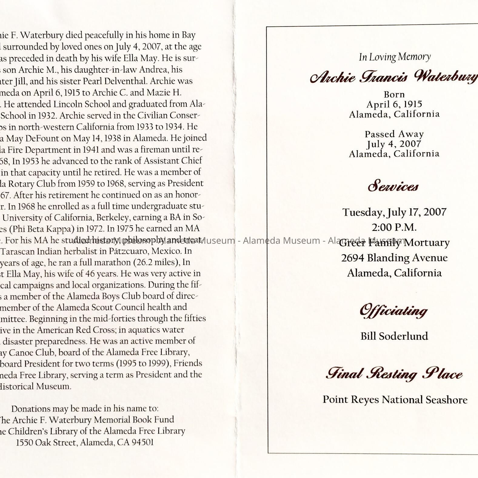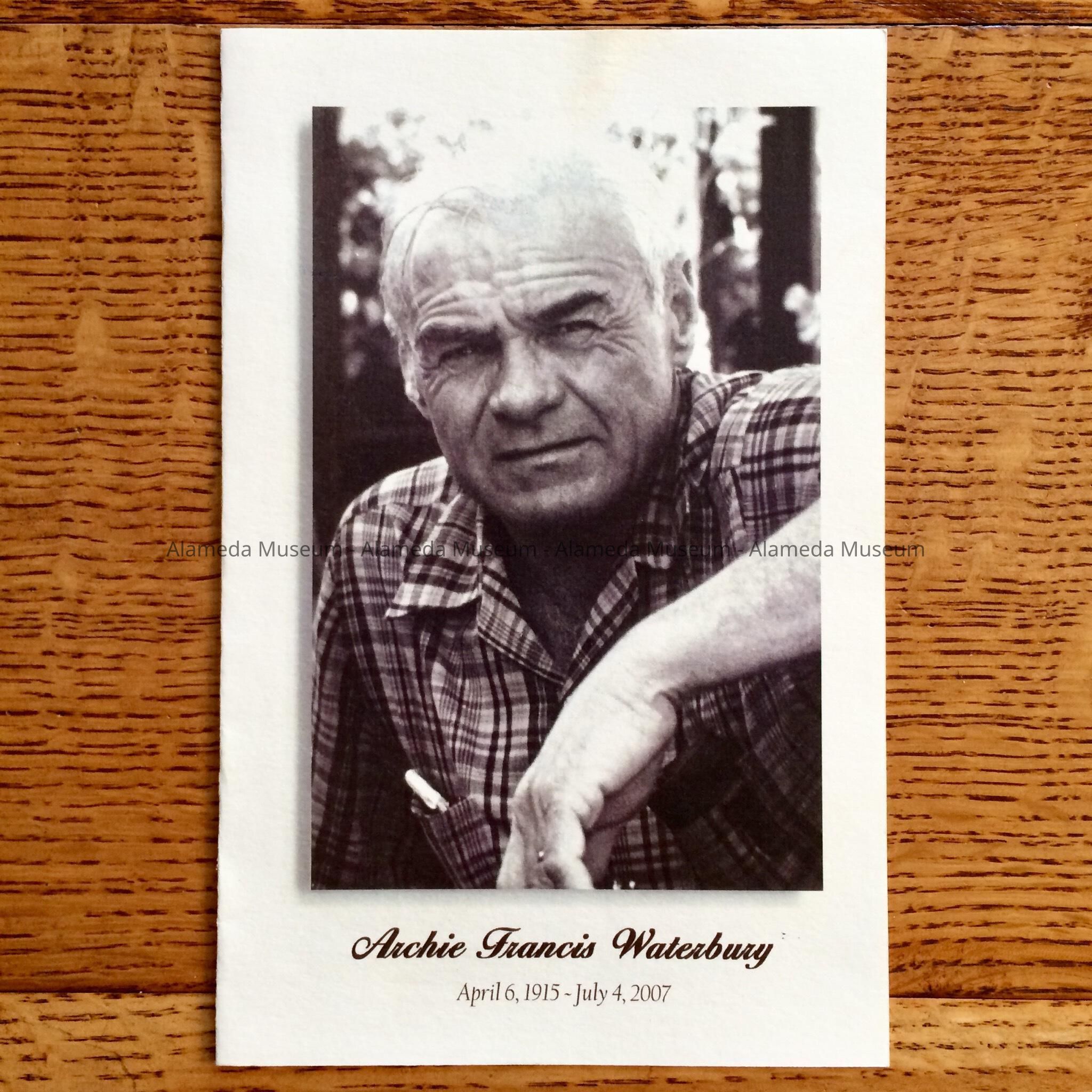 A MEMORIAL BOOKLET FROM THE SERVICES OF THE LATE ARCHIE WATERBURY (1915-2007), LIFELONG RESIDENT OF ALAMEDA AND FORMER ASSISTANT FIRE CHIEF.