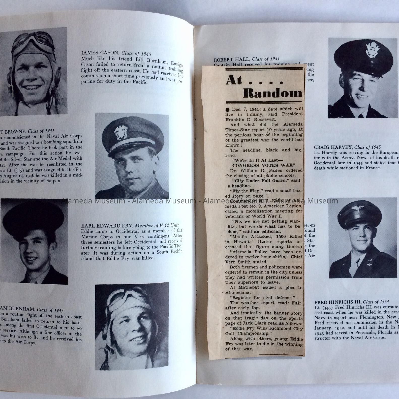 HISTORY OF OBJECT: A BOOKLET ISSUED AND CREATED BY OCCIDENTAL COLLEGE, LOS ANGELES, IN MEMORY OF MILITARY ALUMNI WHO WERE LOST, OR DIED DURING WW-II. BOOKLET INCLUDES PHOTOS AND BIOGRAPHIES OF THOSE PICTURED.