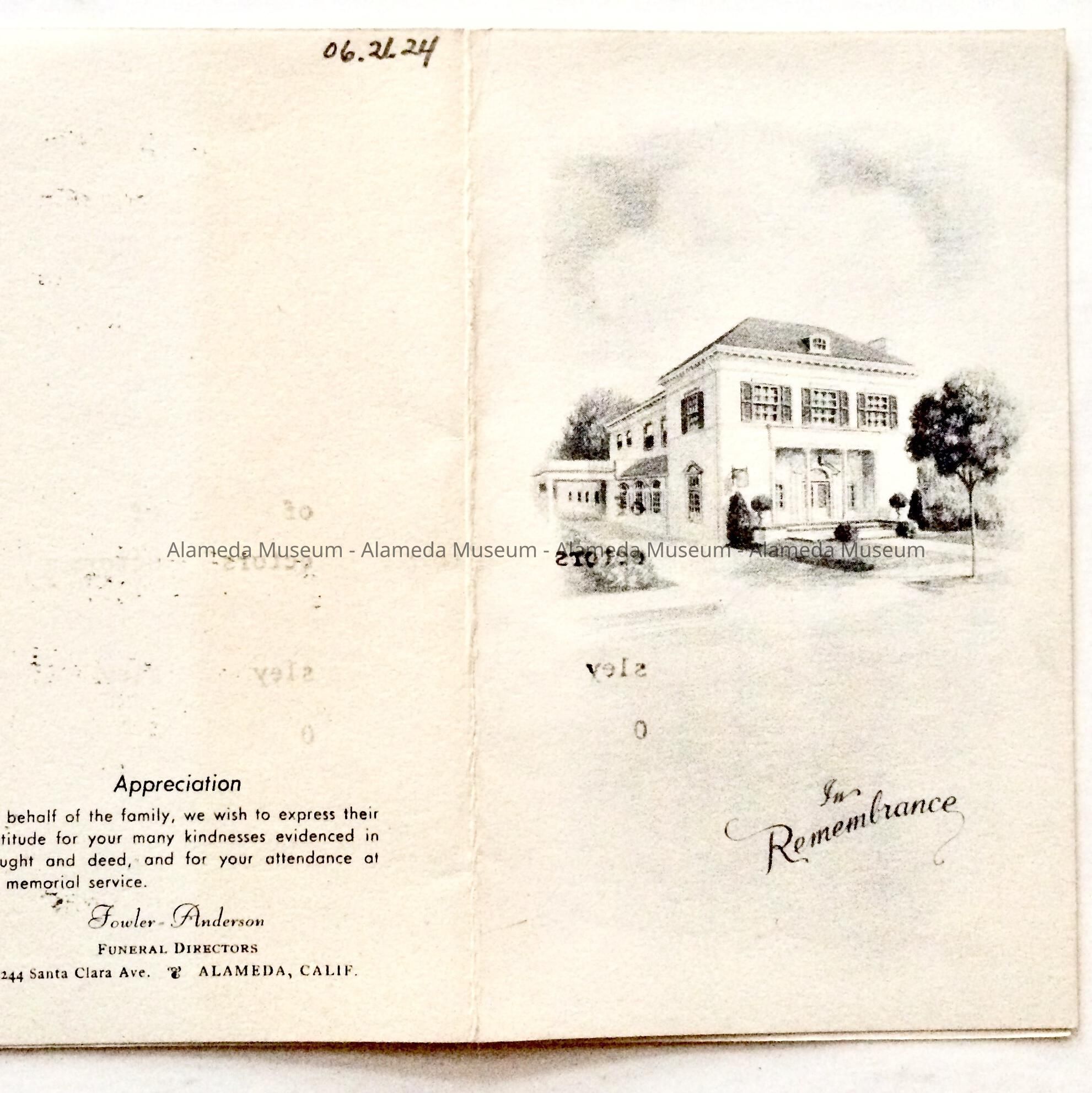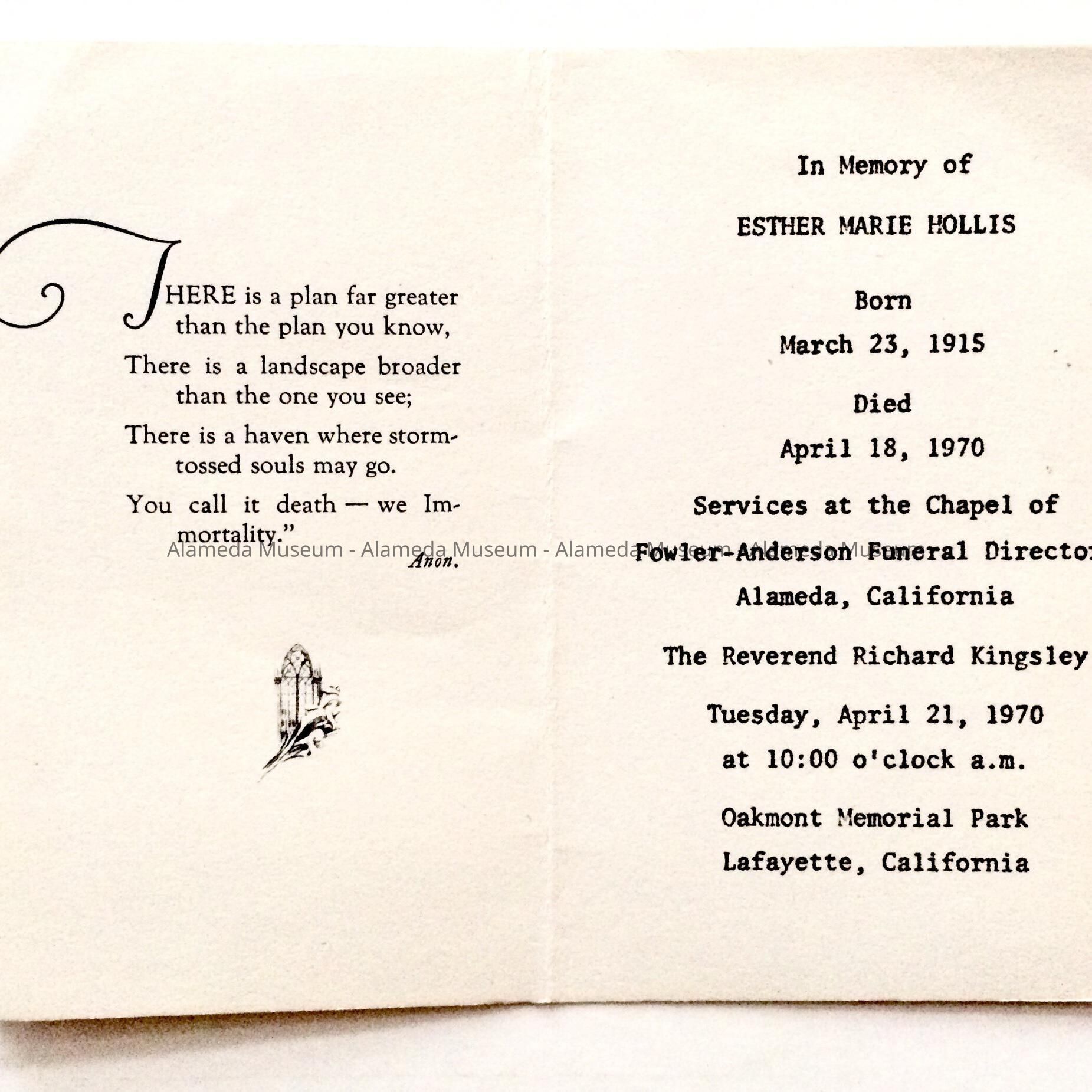 HISTORY OF OBJECT: A MEMORIAL CARD (OR BOOKLET) ISSUED FOR THE SERVICES OF THE LATE ESTHER MARIE HOLLIS, WIFE OF AN ALAMEDA POSTAL EMPLOYEE. MRS. HOLLIS HAD MOVED TO ALAMEDA IN 1944 AND PASSED AWAY ON APRIL 18, 1970.