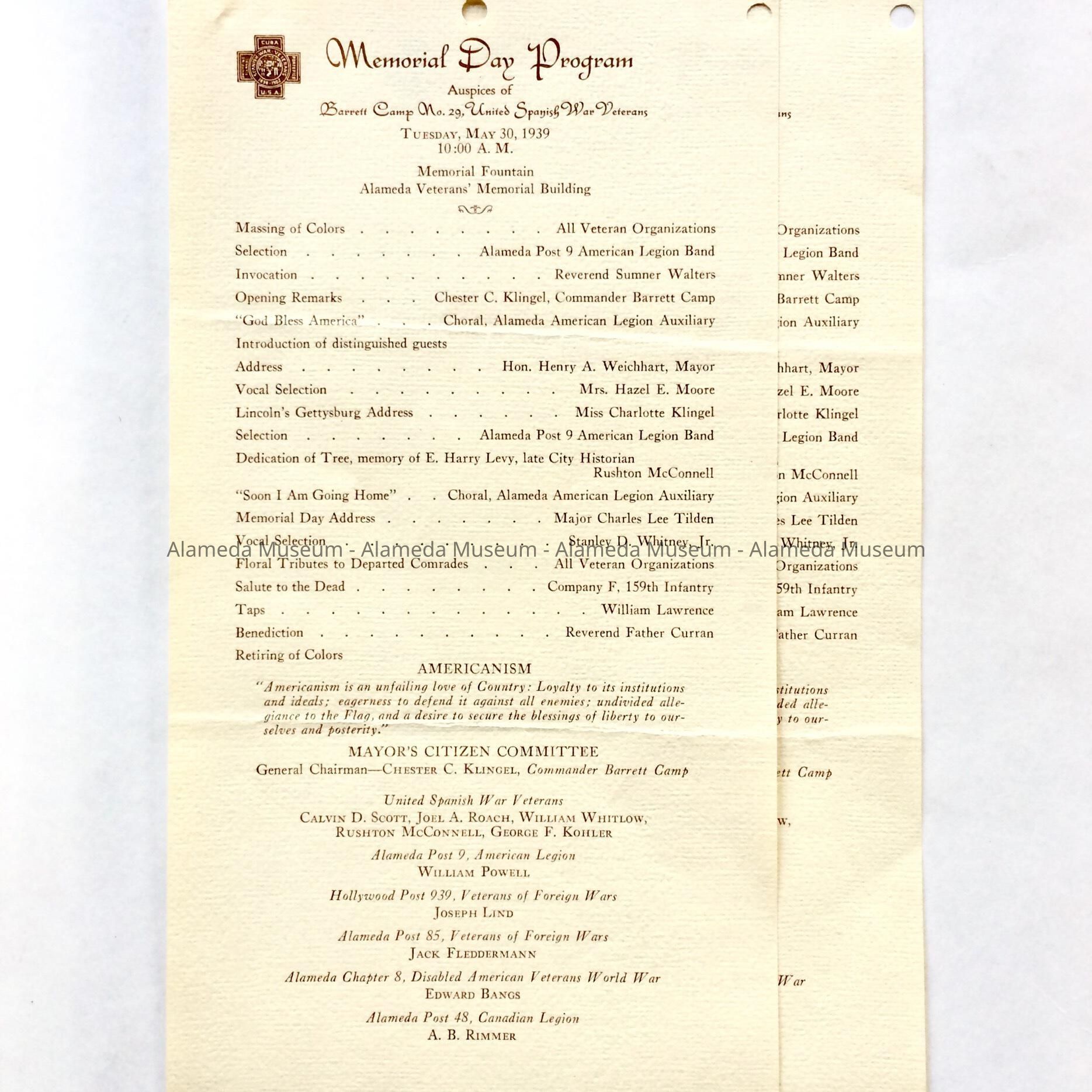 HISTORY OF OBJECT: PROGRAM LISTING EVENTS IN MEMORIAL DAY PROGRAM, MAY 30, 1939, AT THE ALAMEDA VETERANS' MEMORIAL BUILDING, CENTRAL AVENUE AT OAK STREET.