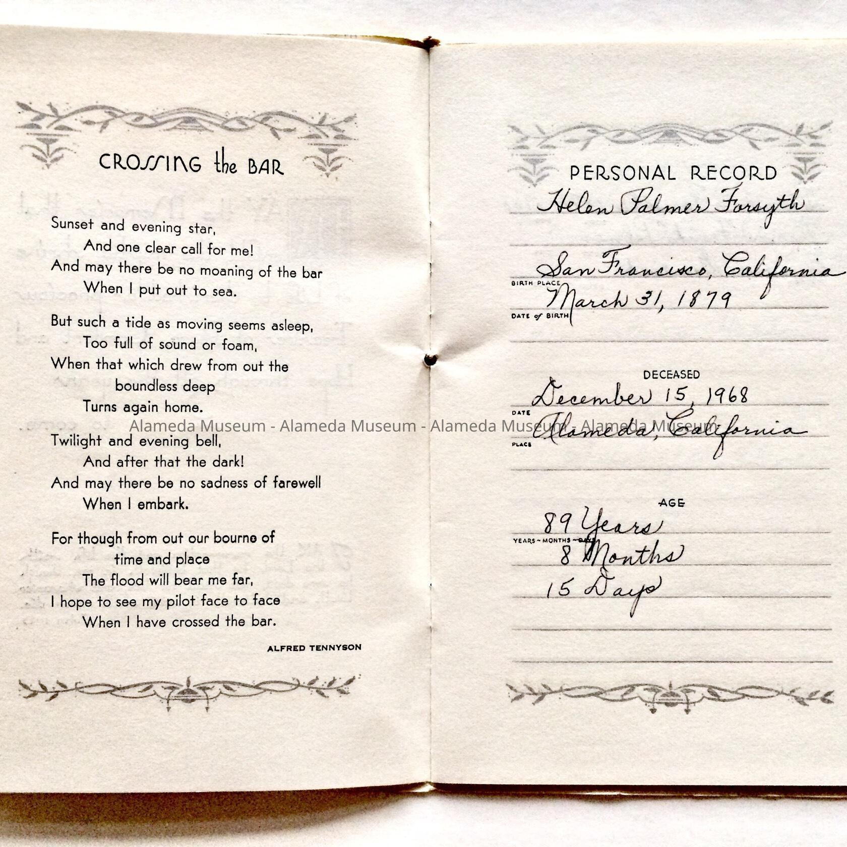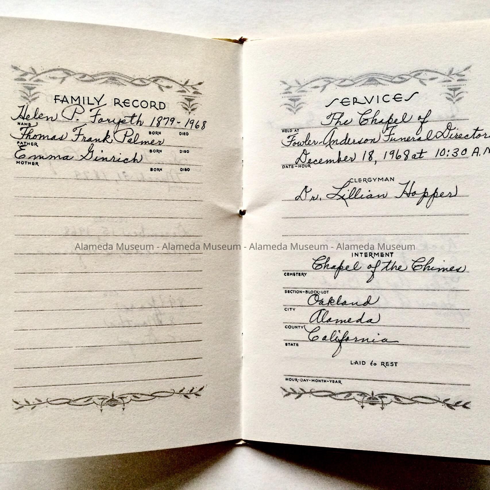 HISTORY OF OBJECT: A MEMORIAL RECORD FOR THE LATE HELENE PALMER FORSYTH, BORN IN SAN FRANCISCO ON MARCH 31, 1879; DIED IN ALAMEDA ON DECEMBER 15, 1968. SHE CAME TO ALAMEDA WITH HER MOTHER AND 6-YEAR OLD SON FOLLOWING THE EARTHQUAKE AND FIRE IN SAN FRANCISCO (WHERE THEY WERE BURNED OUT). SHE SUBSEQUENTLY HAD A SECOND CHILD-HELENE (HELENA) AMES. MRS. FORSYTH AND HER LATE HUSBAND, WILLIAM C. FORSYTH WERE RESPONSIBLE FOR HAVING THE HOME AT 2146 SAN JOSE AVENUE CONSTRUCTED. SHE RESIDED IN ALAMEDA 62 YEARS, AND PASSED AWAY ON DECEMBER 15, 1968 AT 2:30 PM.