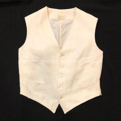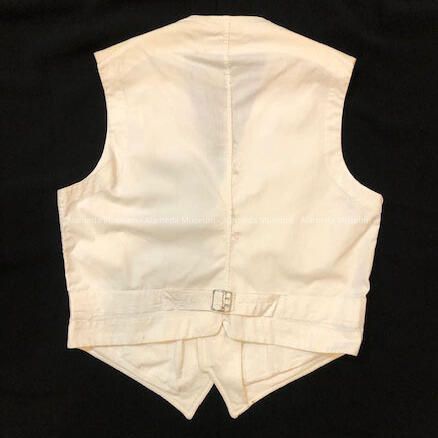 Men's collarless white pique vest. Five mother-of-pearl buttons down front, V-front.