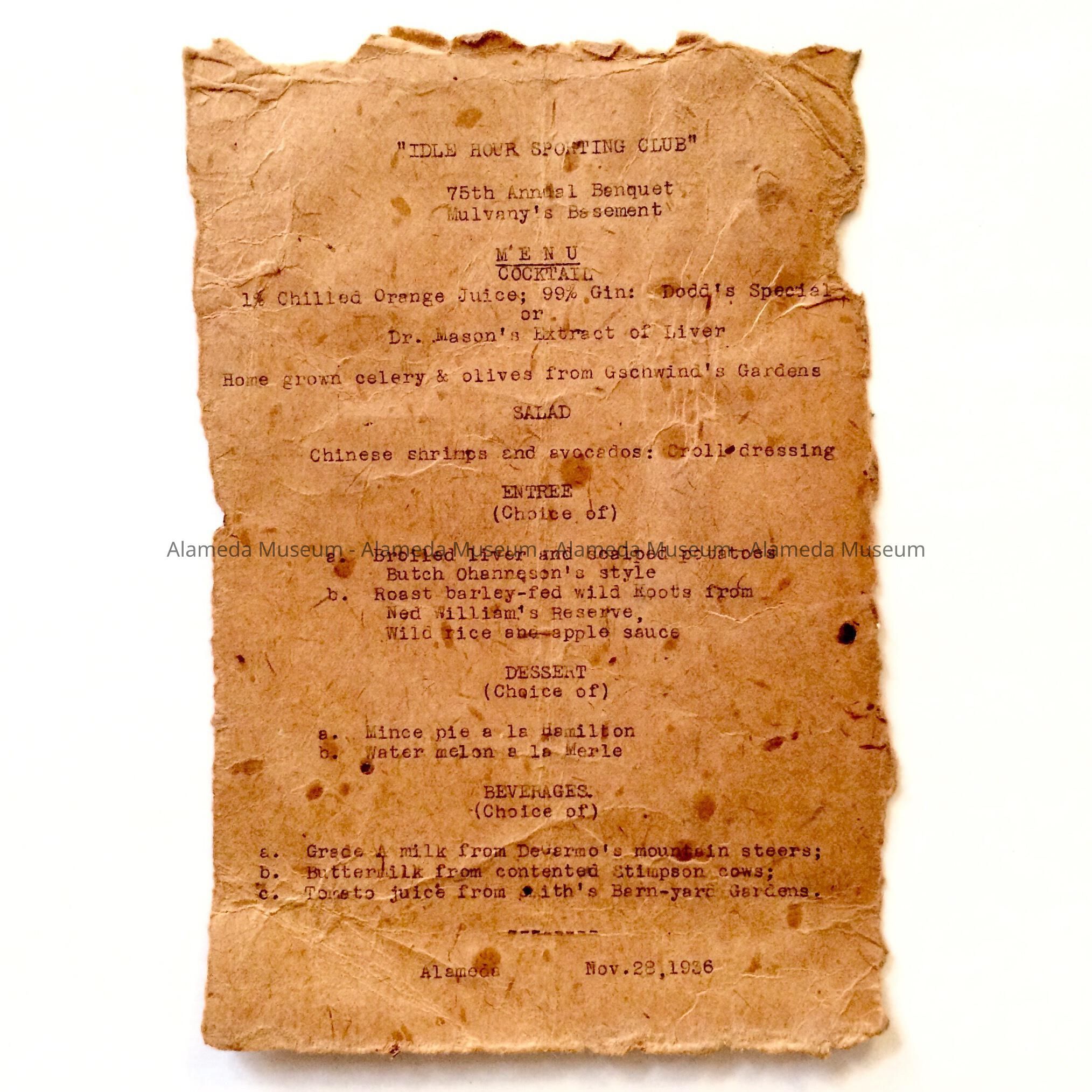 History of Object: Menu, "Idle Hour Sporting Club", 75th annual banquet, held in Mulvany's basement (Mulvany being a prominent Alameda citizen), November 28, 1936. On the menu are dishes to be served with the names of the participants combined in the titles of each course.
