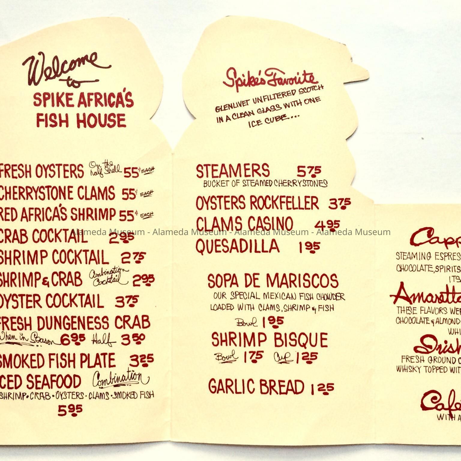 A MENU FOR A BUSINESS WHOSE MENU OFFERED SEAFOOD. THE RESTAURANT WAS NAMED, "SPIKE AFRICA'S" FISH HOUSE, WHICH WAS LOCATED NEAR THE POSEY TUBE IN WEST ALAMEDA.