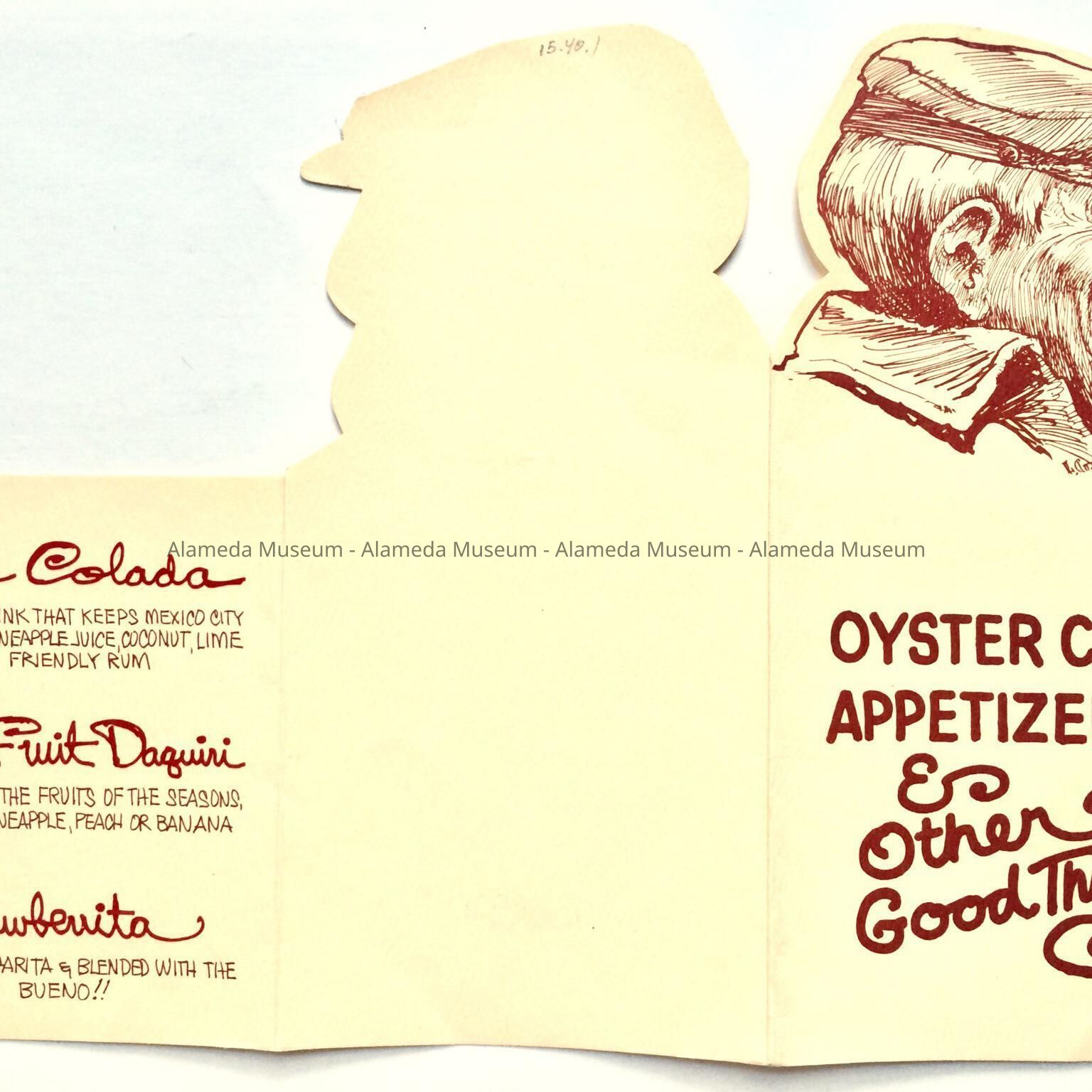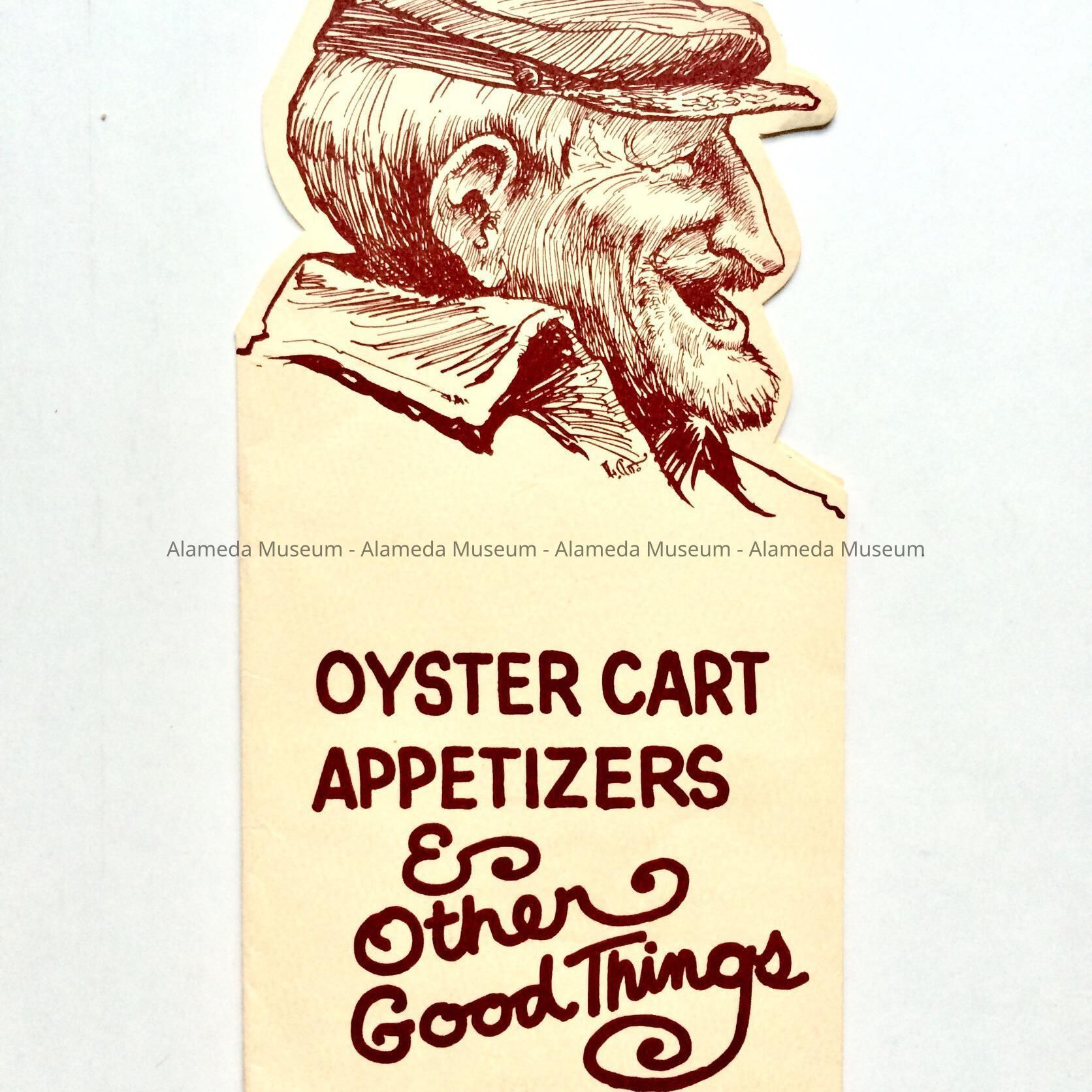 A MENU WITH ILLUSTRATED COVER, "SAYLOR" AND PROFILE IN BOLD-PRINTED CAPTION, "OYSTER CART" IN RED-COLORED TYPE ON AN OFF-WHITE-COLORED BACKGROUND.
