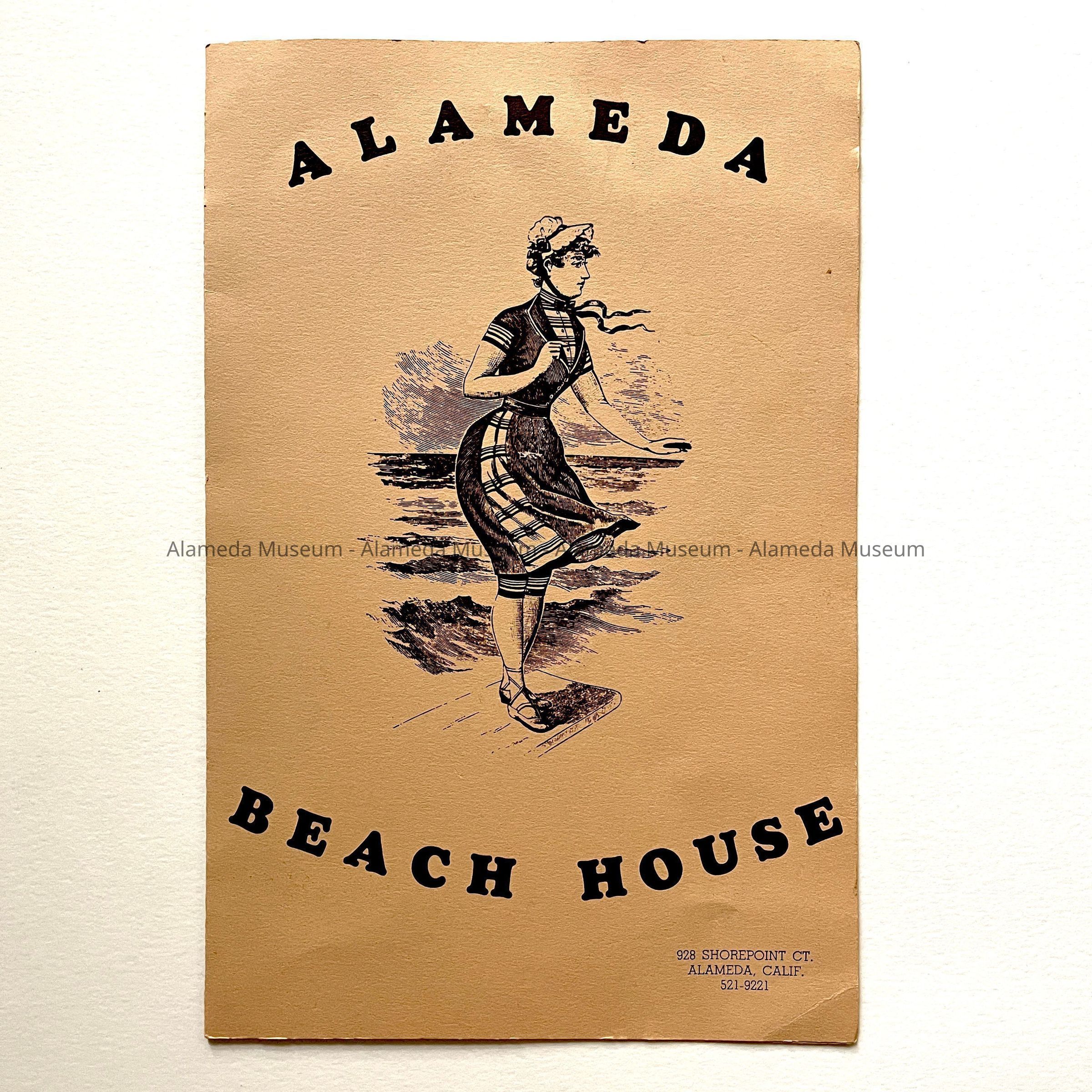 Description: booklet formed by a tan sheet of card-stock paper, folded once, with on the front an image of a woman in Victorian-era bathing suit with cap, and printed text: 'ALAMEDA / BEACH HOUSE' AND 928 SHOREPOINT CT.' Inside has a background image of a dwelling, and a list of food items and prices; verso also has prices.