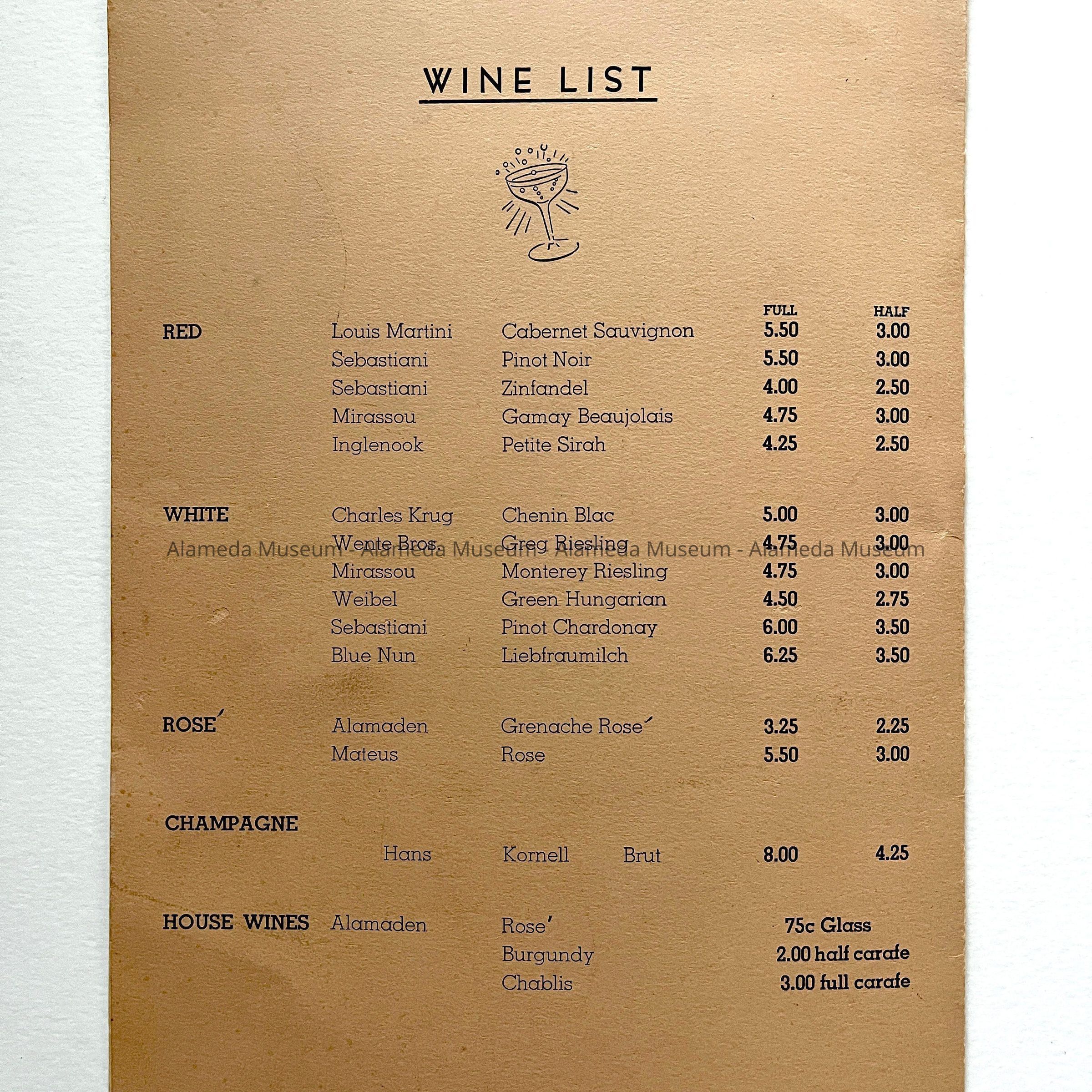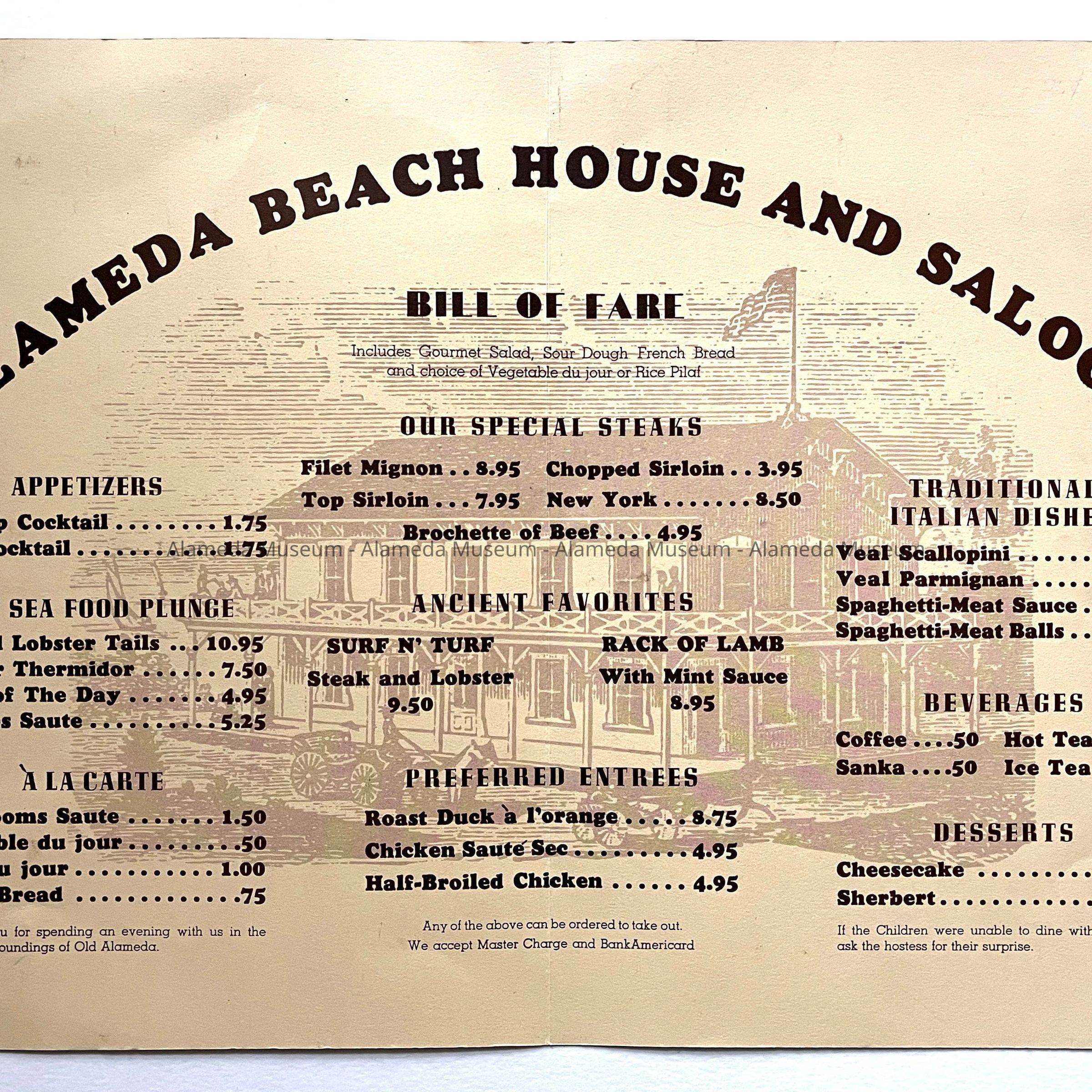 Menu of the 'Alameda Beach House' restaurant, c. 1970Entry/Object ID