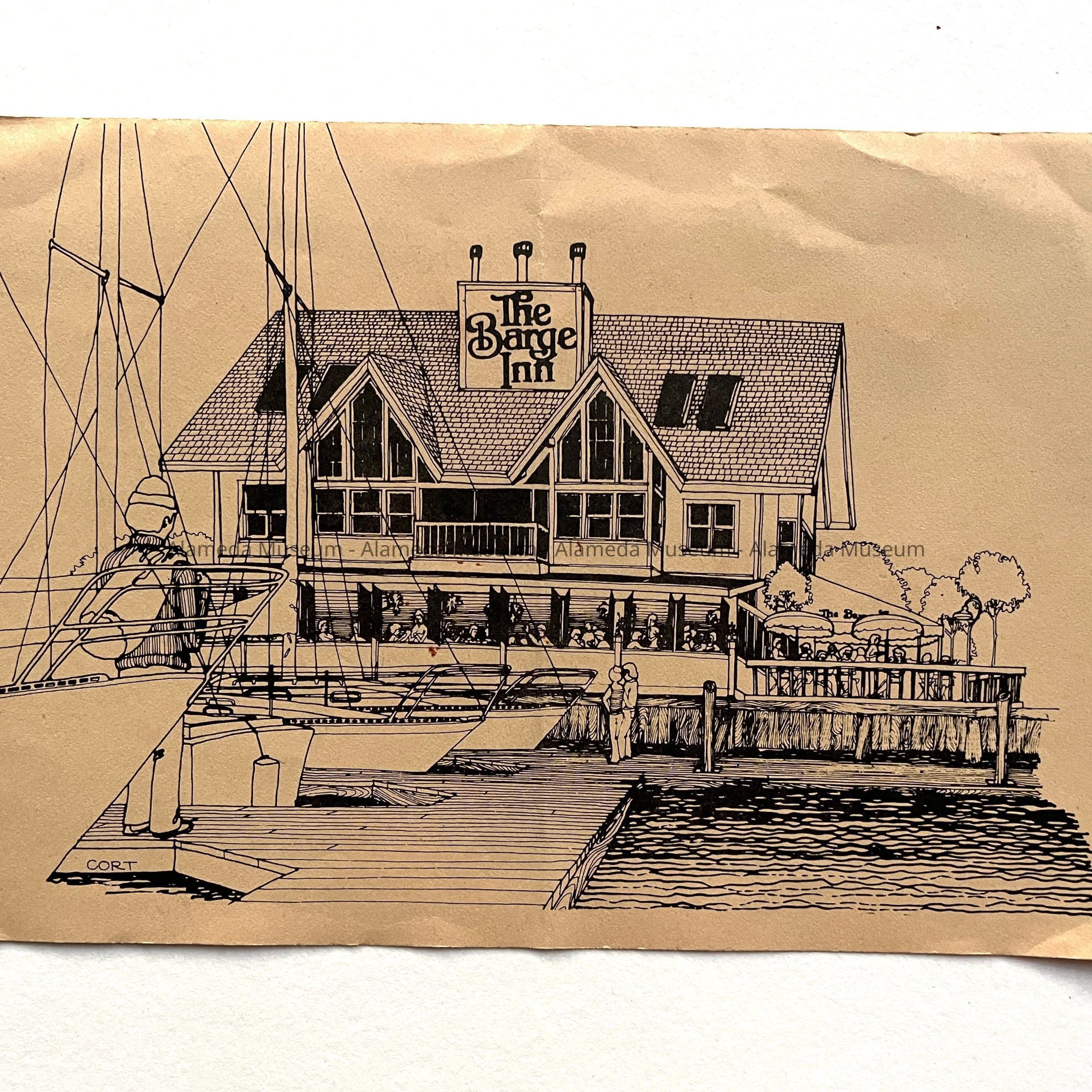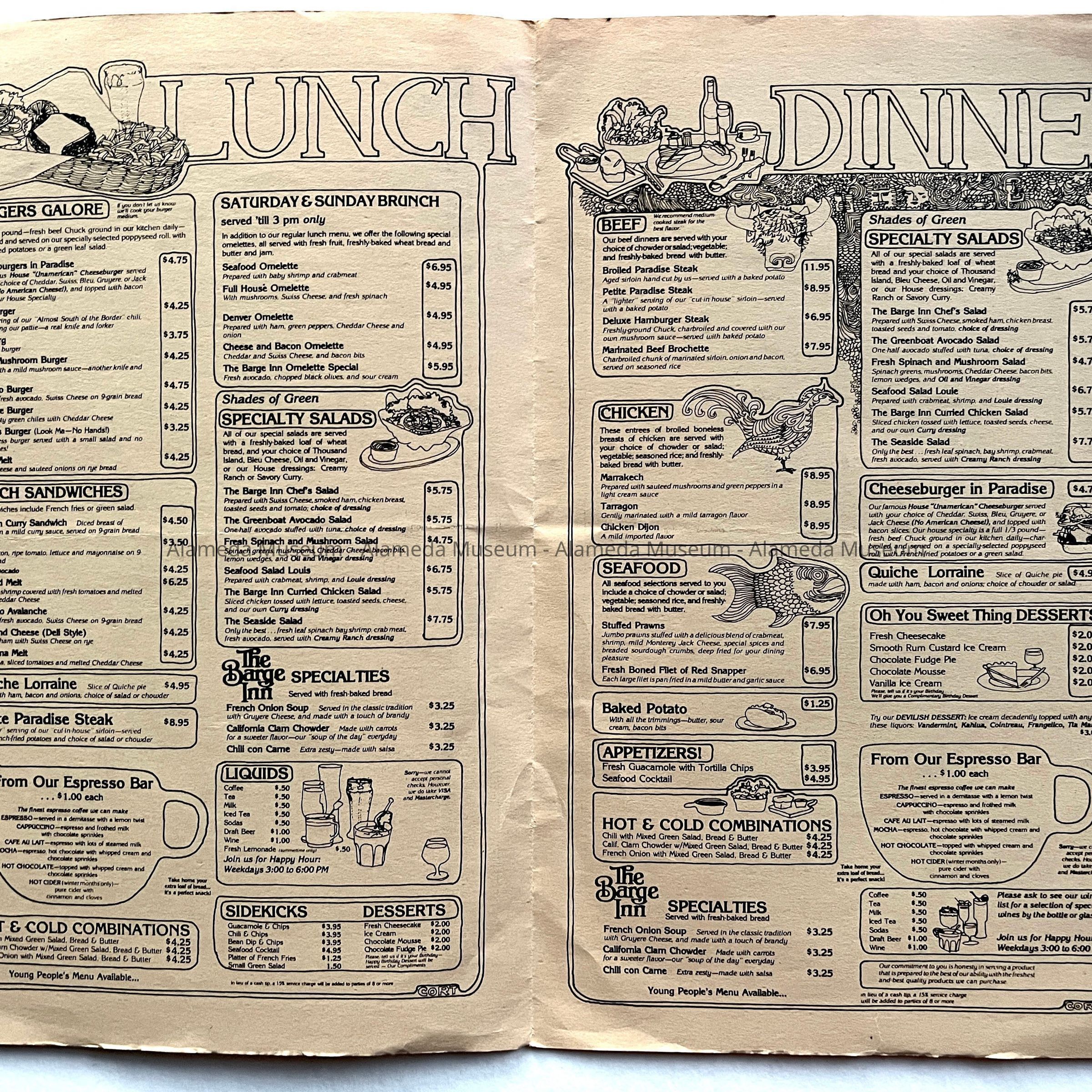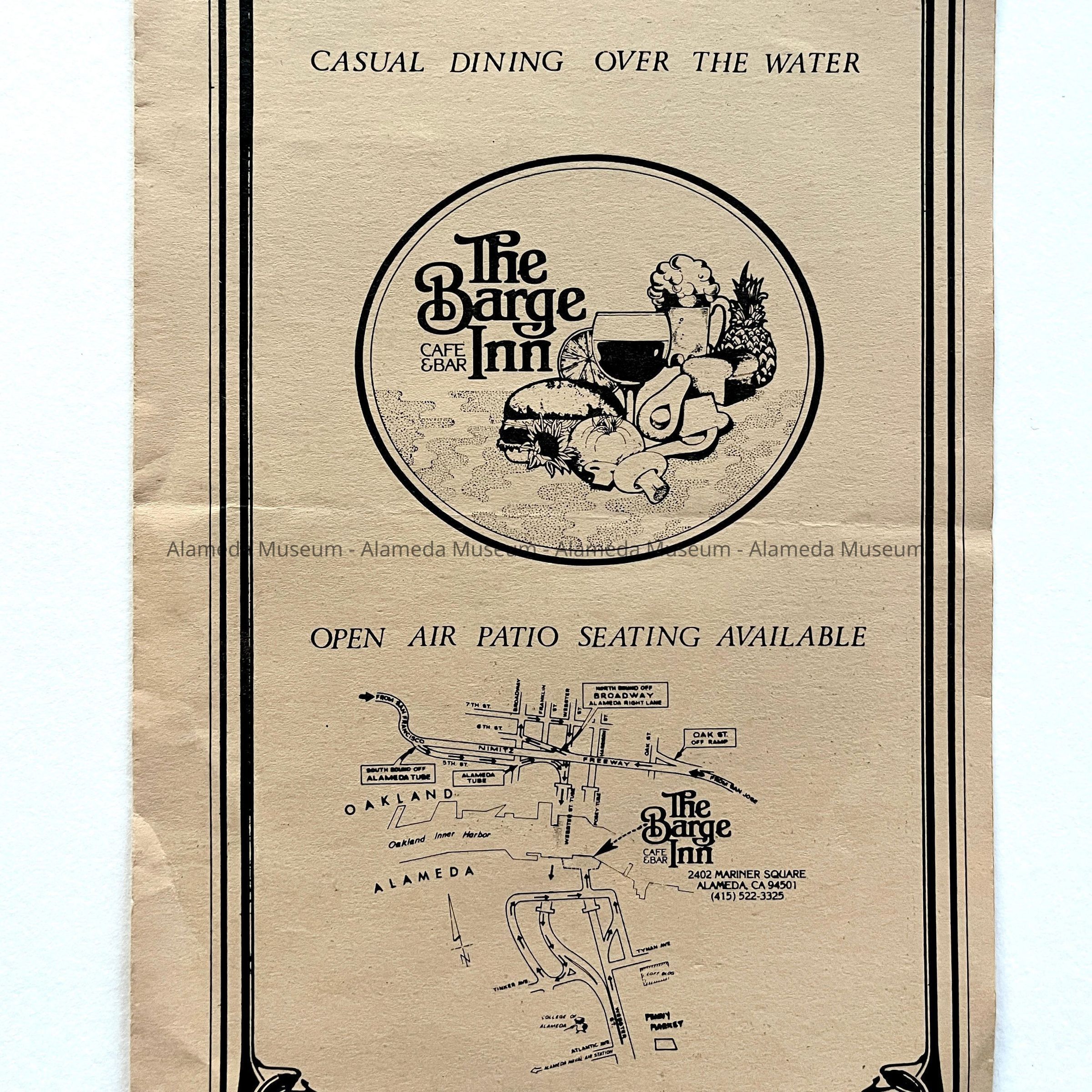 History of Object: Menu from cafe-bar The Barge Inn, 2402 Mariner Square Dr. The address is 2402 Mariner Square, phone number (415) 522-3325.