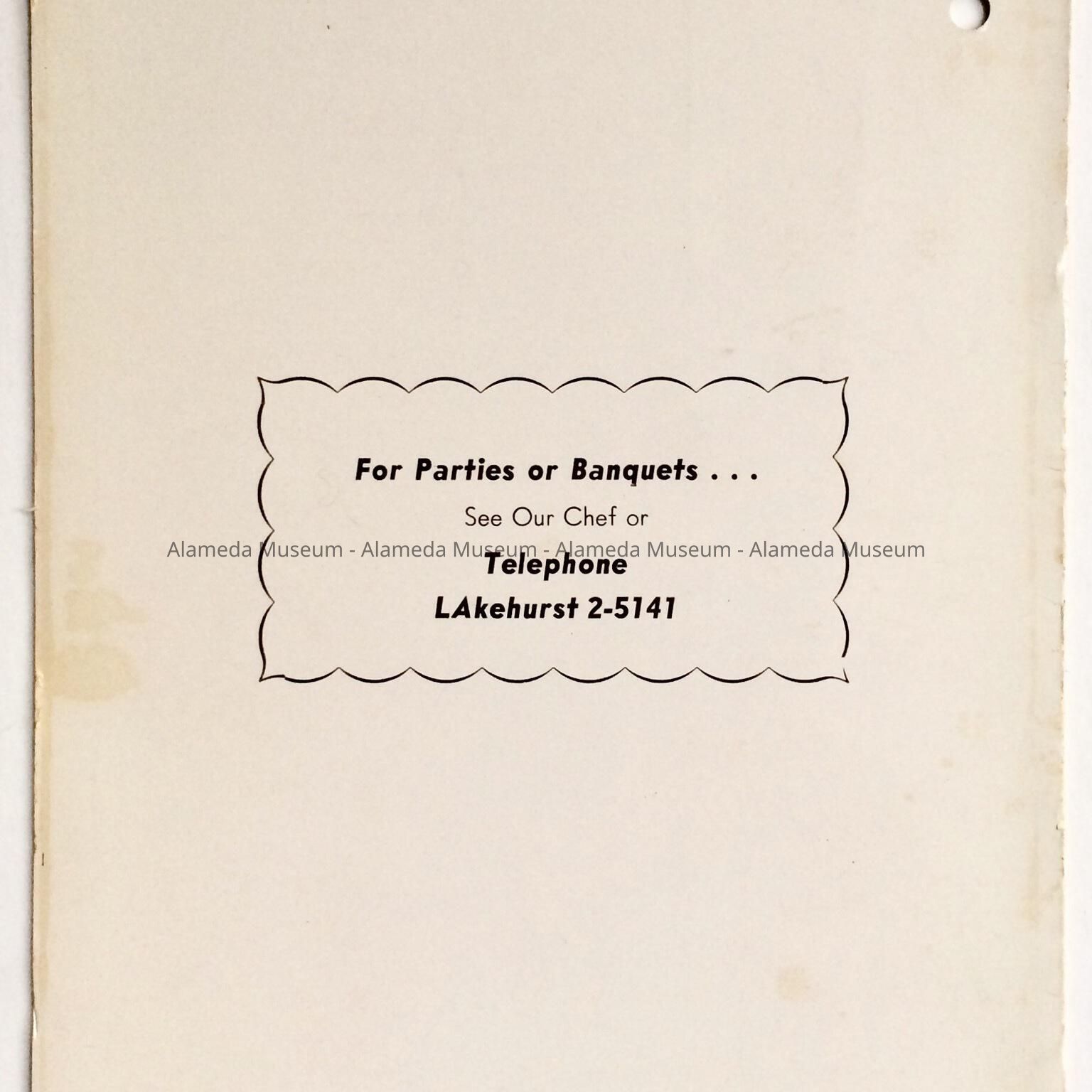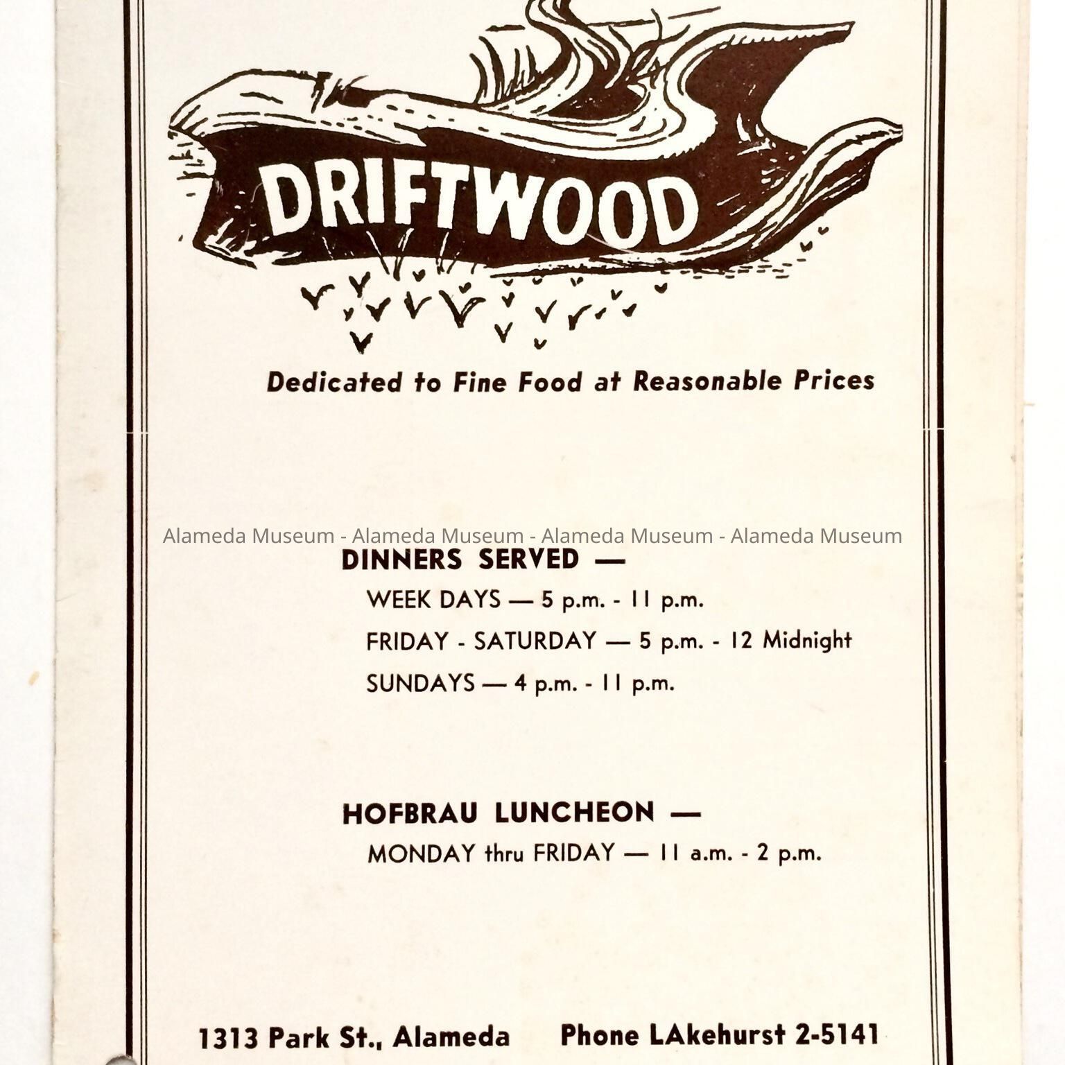 A MENU FOR THE DRIFTWOOD RESTAURANT, 1313 PARK STREET, ALAMEDA; TELEPHONE LA 2-5141.