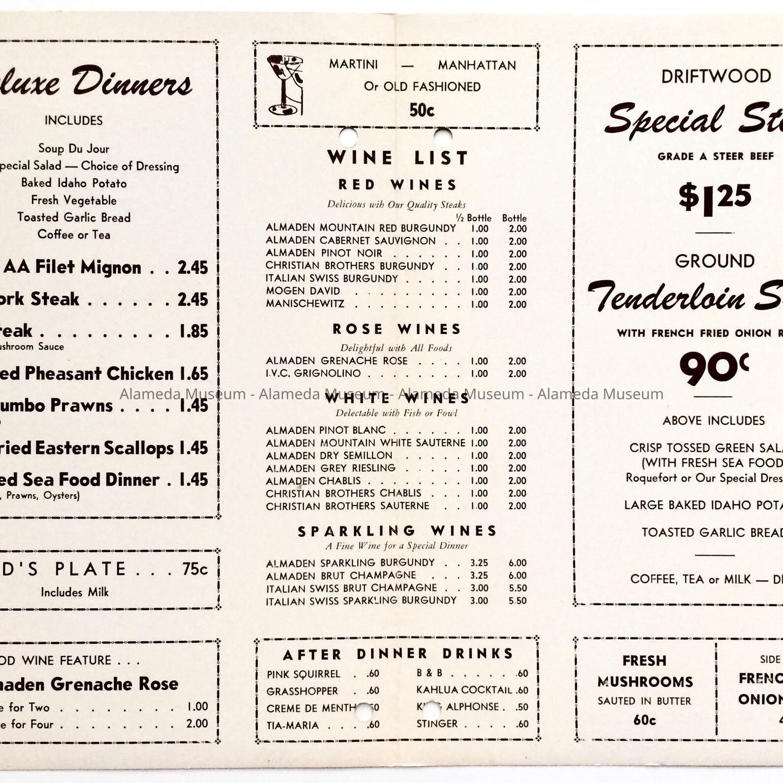 Menu of the Driftwood Restaurant, prior to 1970Entry/Object ID