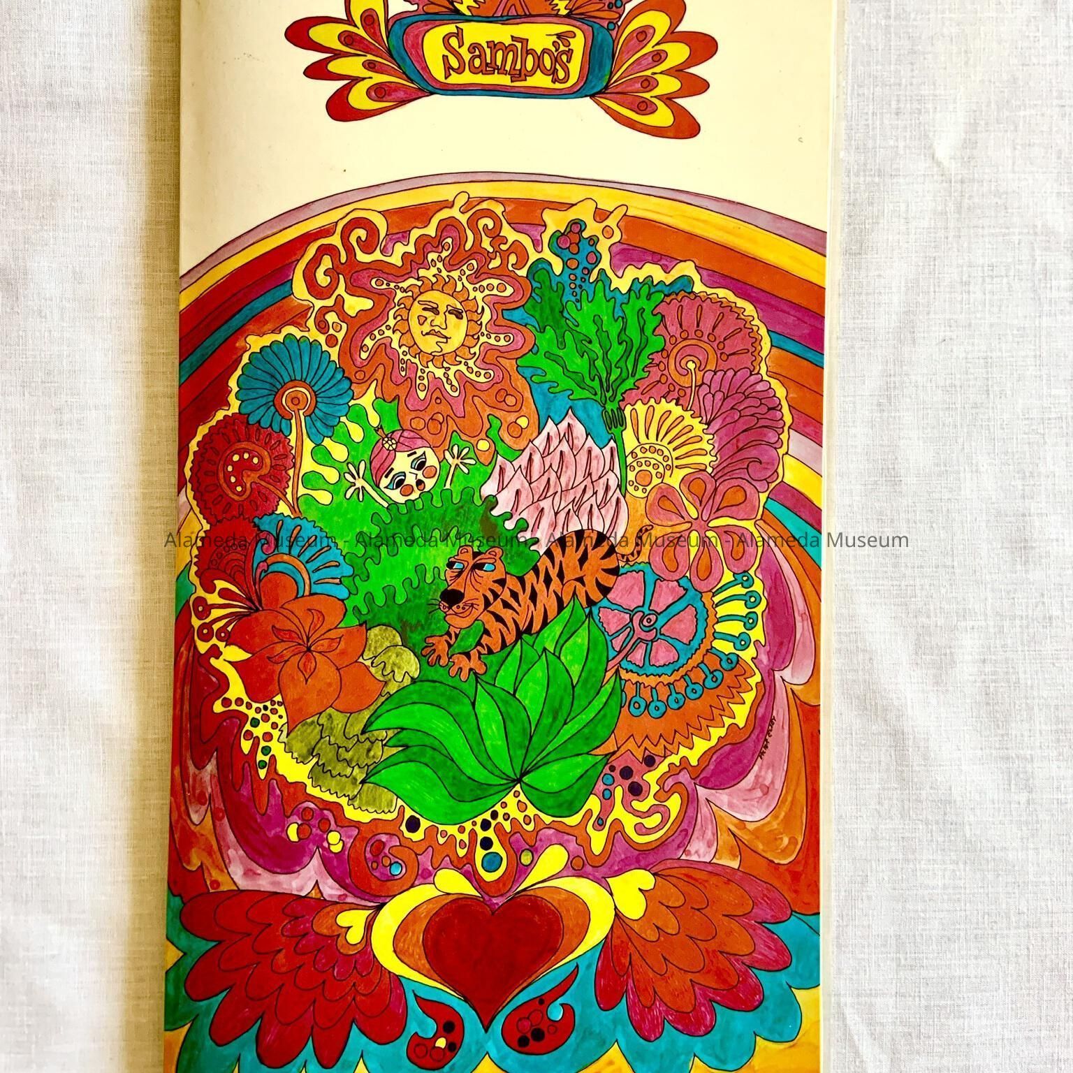 Description: Lamined duo-fold multi-colored menus. Cover has a psychedelic floral design within which Sambo and his tiger may be found.