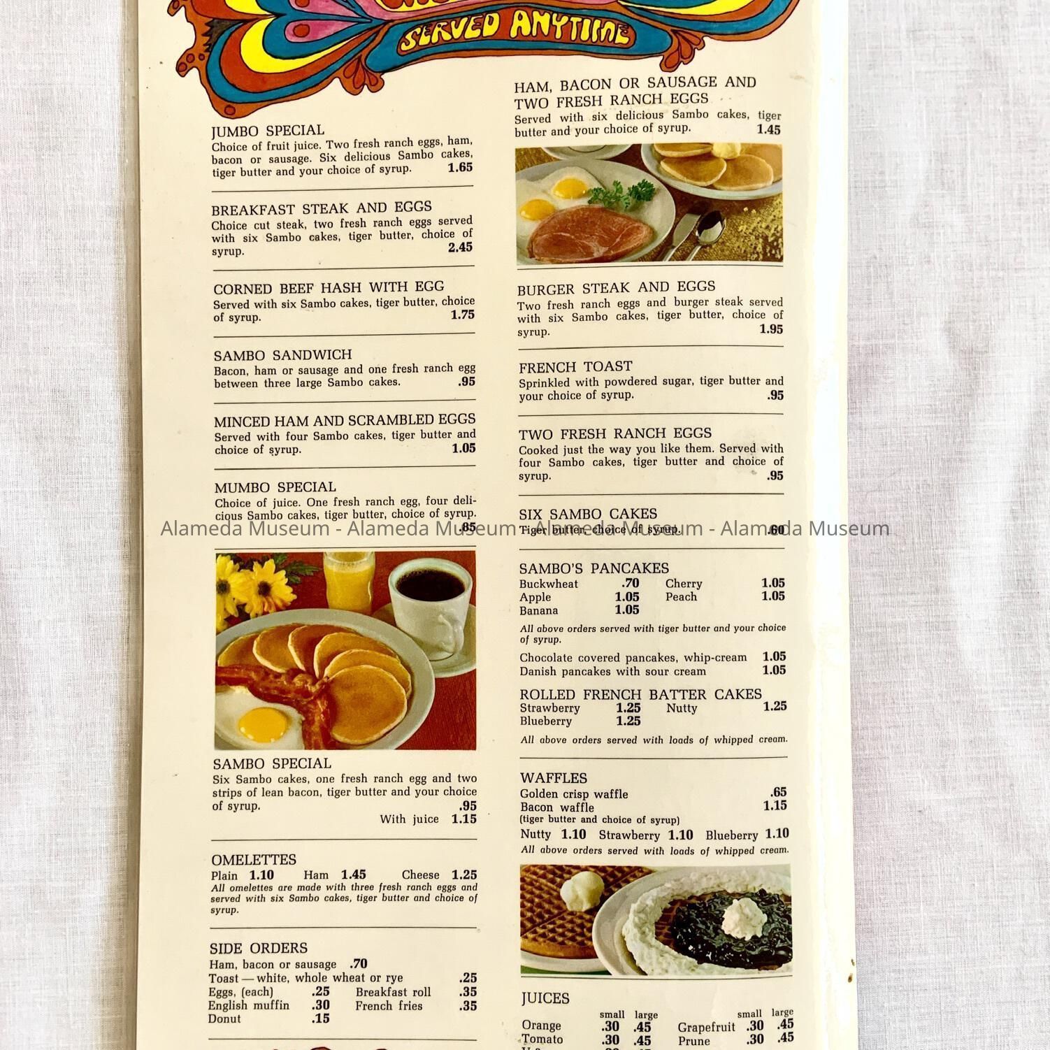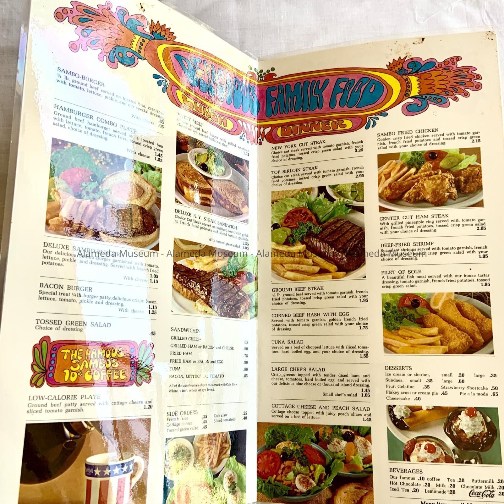 History of Object: Menus used at Sambo's Restaurant, Alameda, in the early 1970's. Part of the collection of the late Samuel Purdy, an original employee.