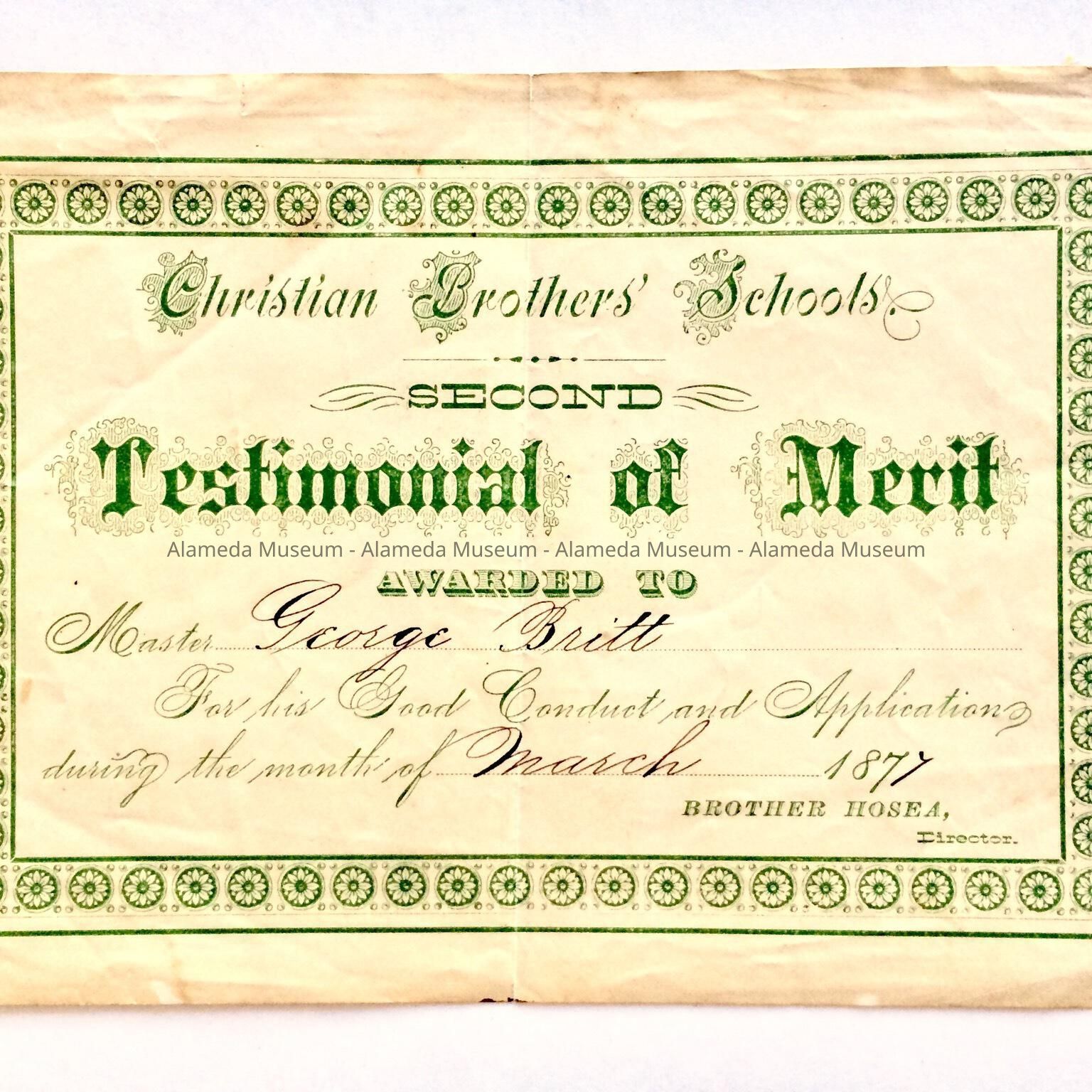 Second Testimonial of Merit awarded to George Britt, son of Patrick Britt Sr., early pioneer resident of the West End of Alameda, March, 1877. From the Christian Brothers Schools, (possibly located in Oakland) by Brother Hosea, director.