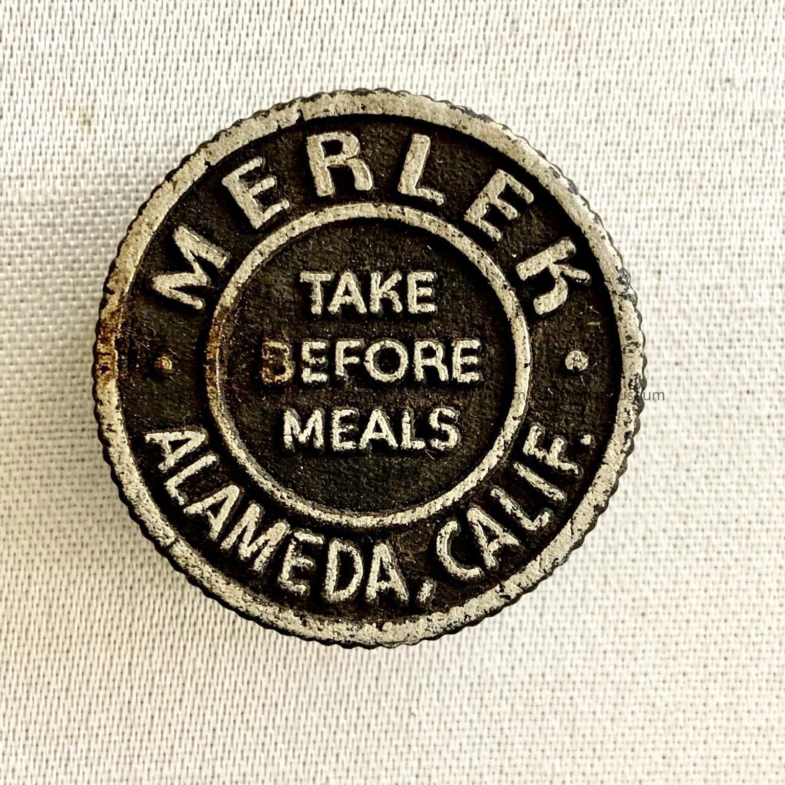 Description: Black colored, hard rubber stopper, with raised letters “Merlek Alameda, Calif. Take before meals”.
