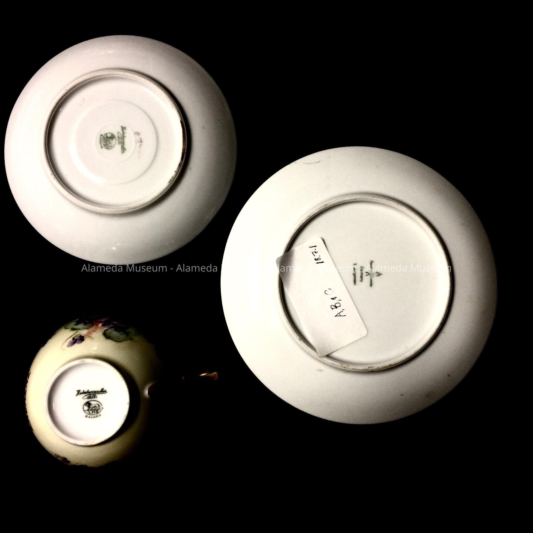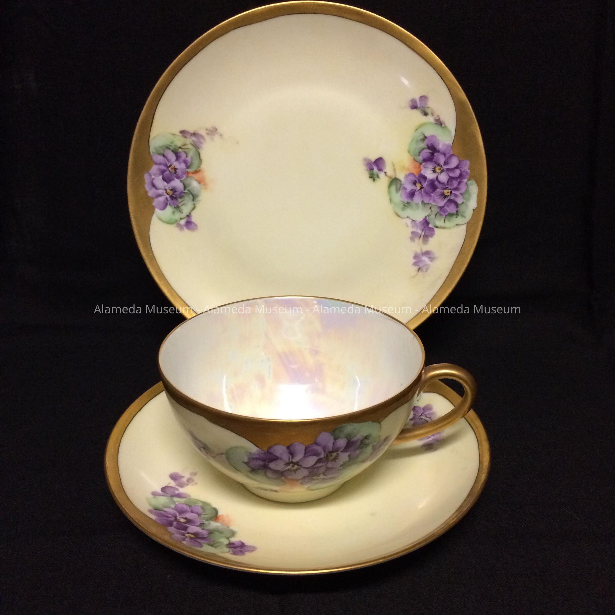 History of Object: A cup and saucer and luncheon plate that were painted by Alameda artist Thomas P. S. Jorgensen and was arranged by a person who was a friend of Maurine's father. Maurine was the daughter of Wiley and Clare Gardner, longtime residents of Alameda (since 1912). The donor, Maurine Middlecamp, recalls Jorgensen's studio being on the 2nd floor of a commercial building on Webster Street in Alameda. The lower floor is remembered being occupied by a feed and fuel business by a man with a surname sounding like "Campe".