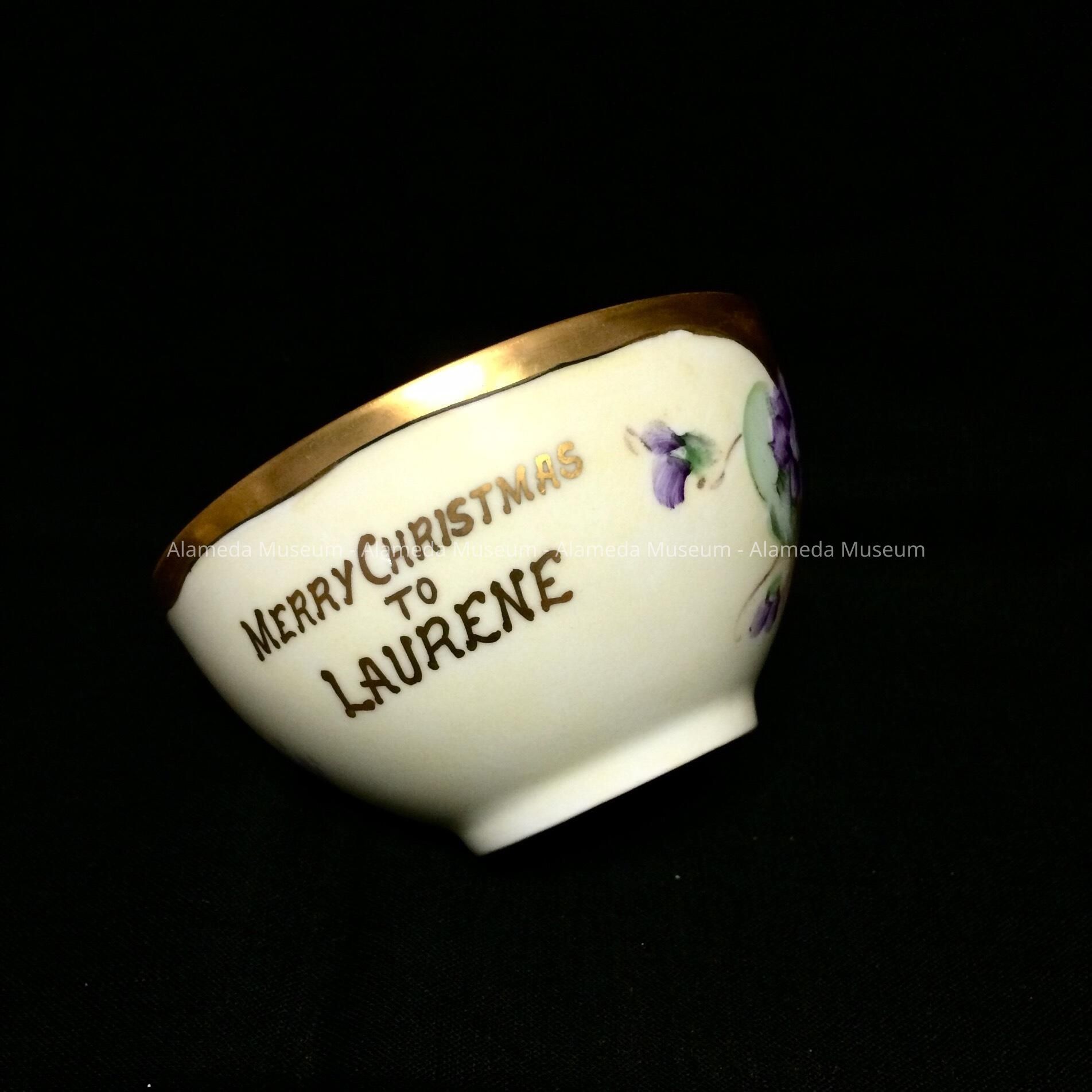 Description: A large size cup with a matching saucer and a luncheon (cake) plate. This set is hand painted on German and Bavarian porcelain. The decorative designs consist of hand painted purple pansies on a yellow background. Their rims are accentuated with gold. The cup's interior has an iridescent rinse and its exterior has the caption, "Merry Christmas to Laurene,” spelled incorrectly, the child's name was actually Maurine.