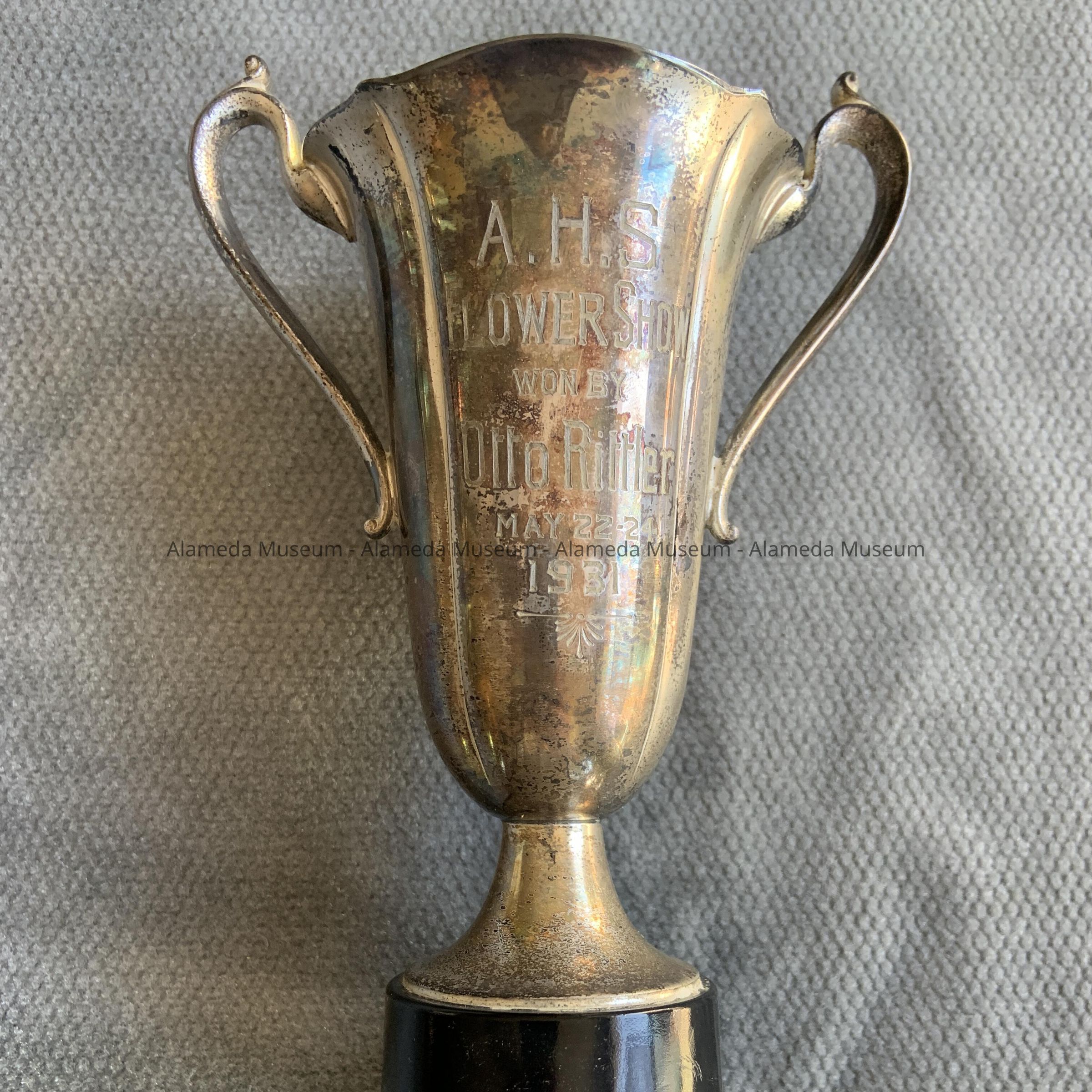 Description: Loving cup with typical shape, made of base metal with worn silver plating on outside of cup and gilding on inside. Cup sits on a black composition base and has two handles. Engraved A.H.S. Flower Show Won by Otto Rittler May 22-24, 1931.