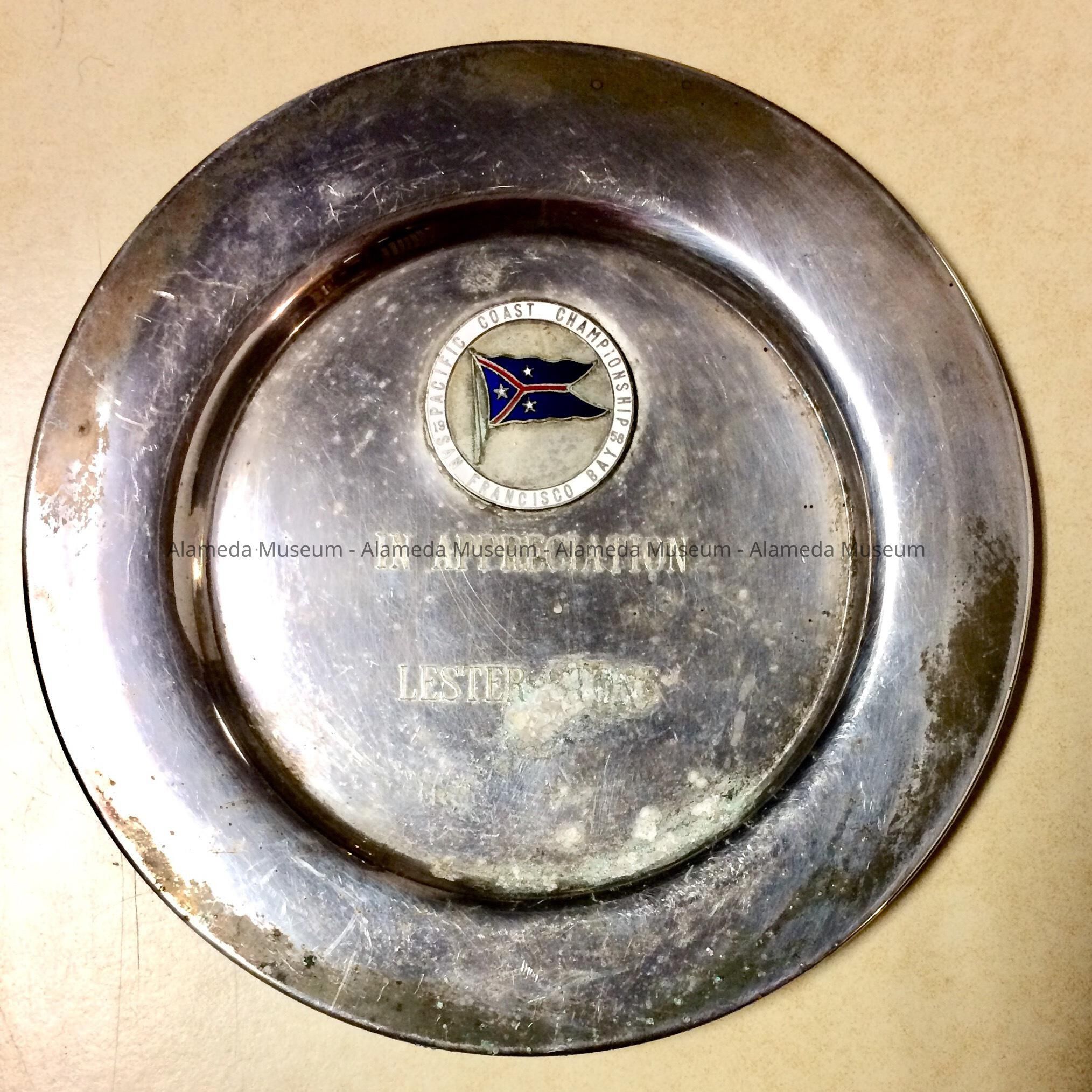 Description: Metal plate, with applied circle, with central image containing a blue enamel flag, and in a circle around it: "Pacific Coast Championship, 1958, San Francisco Bay", and below that: In Appreciation Lester Stone. On the bottom a heraldic shield is engraved, with 'Jaxton Inc., California'.