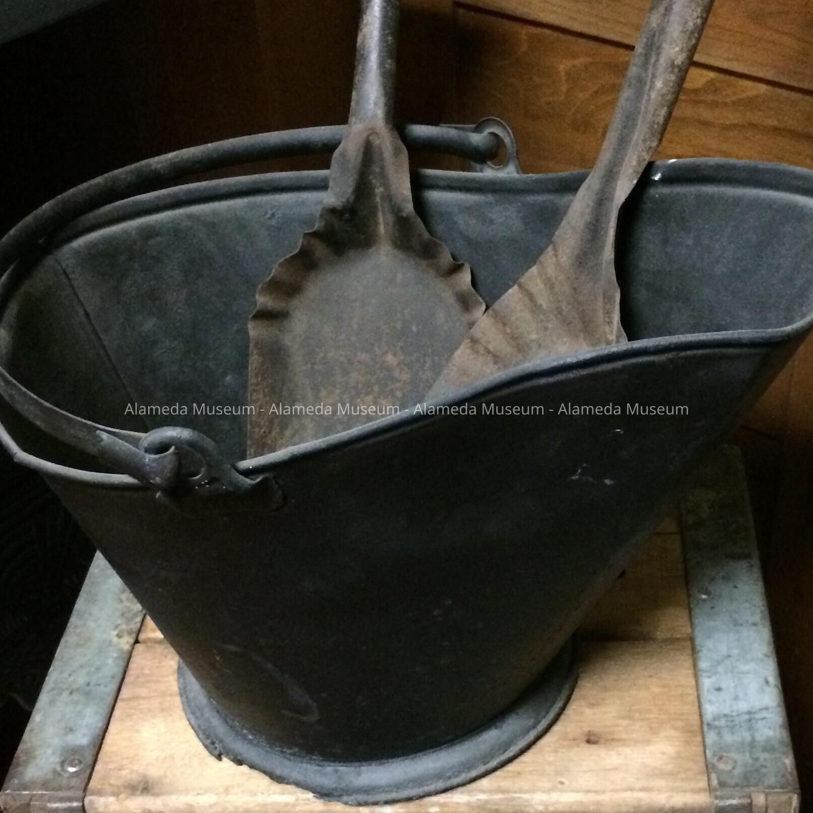 History of Object: Coal scuttle used by the Henry H. Meyers family (2021 Alameda Avenue), old-time residents of Alameda. The Meyers residence was erected in 1897.