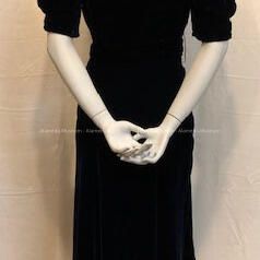Description: Midnight blue panne rayon velvet cocktail dress has V-neck, and soft machine smocking at shoulders. High waistline and belt of same material.