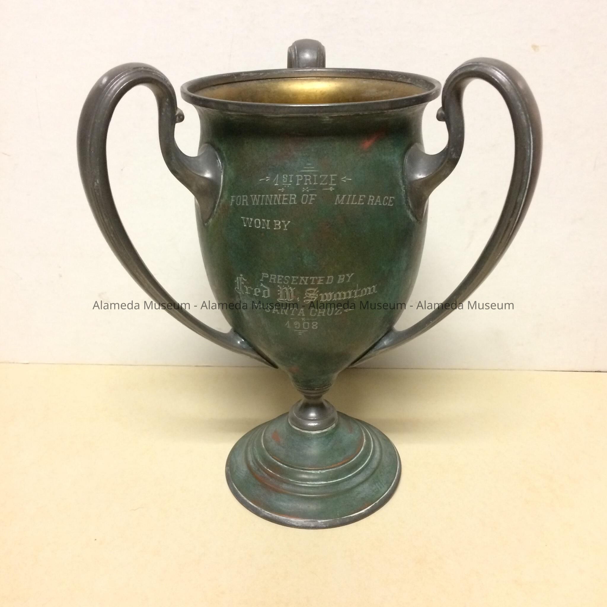 History of Object: Trophy is inscribed: "First Prize for winner of Mile Race won by __(blank). Presented by Fred M. Swanton, Santa Cruz, 1908". The winner was presumably Lester F. Stone, Alameda.
