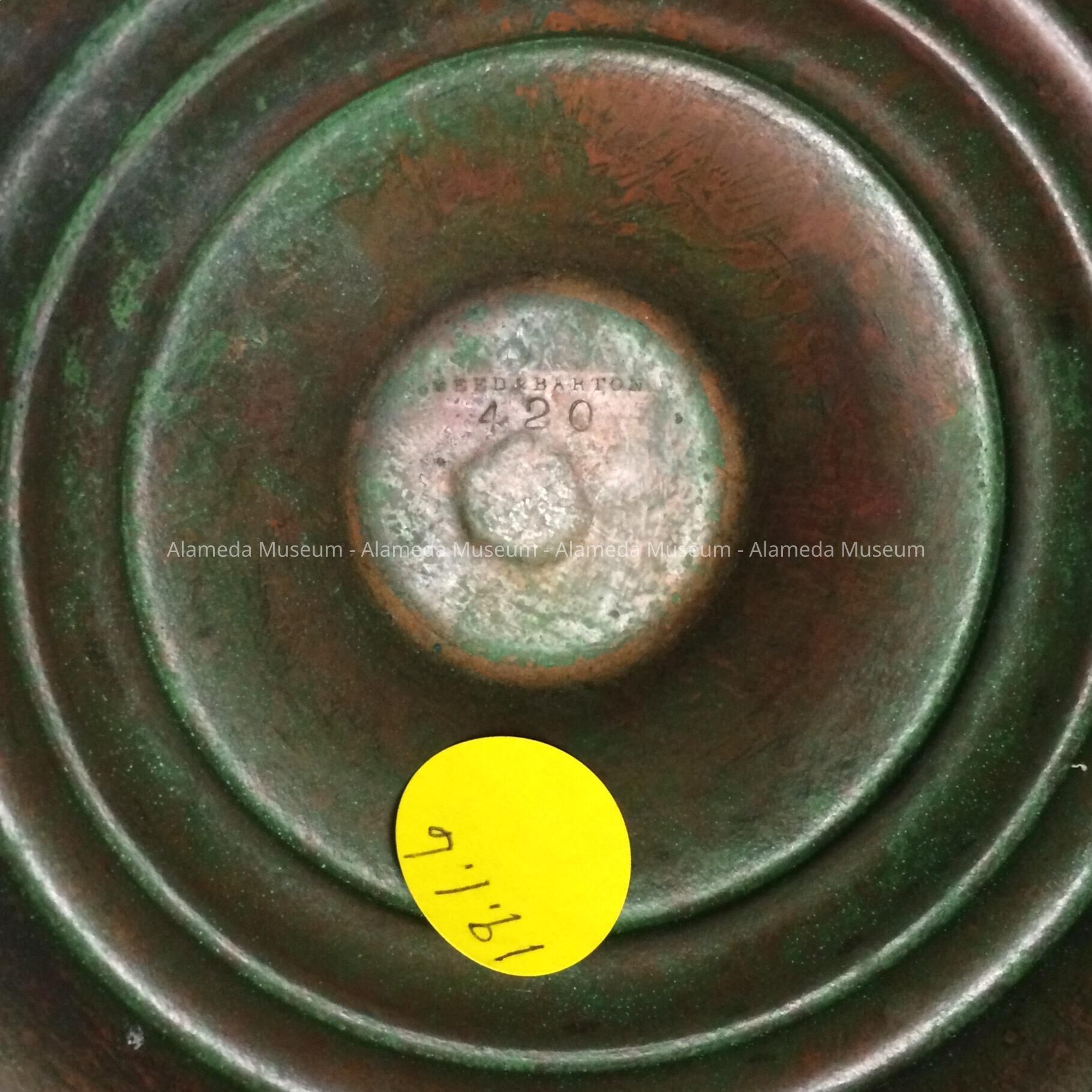 Description: A tri-handled trophy of patinated copper. Maker unknown.