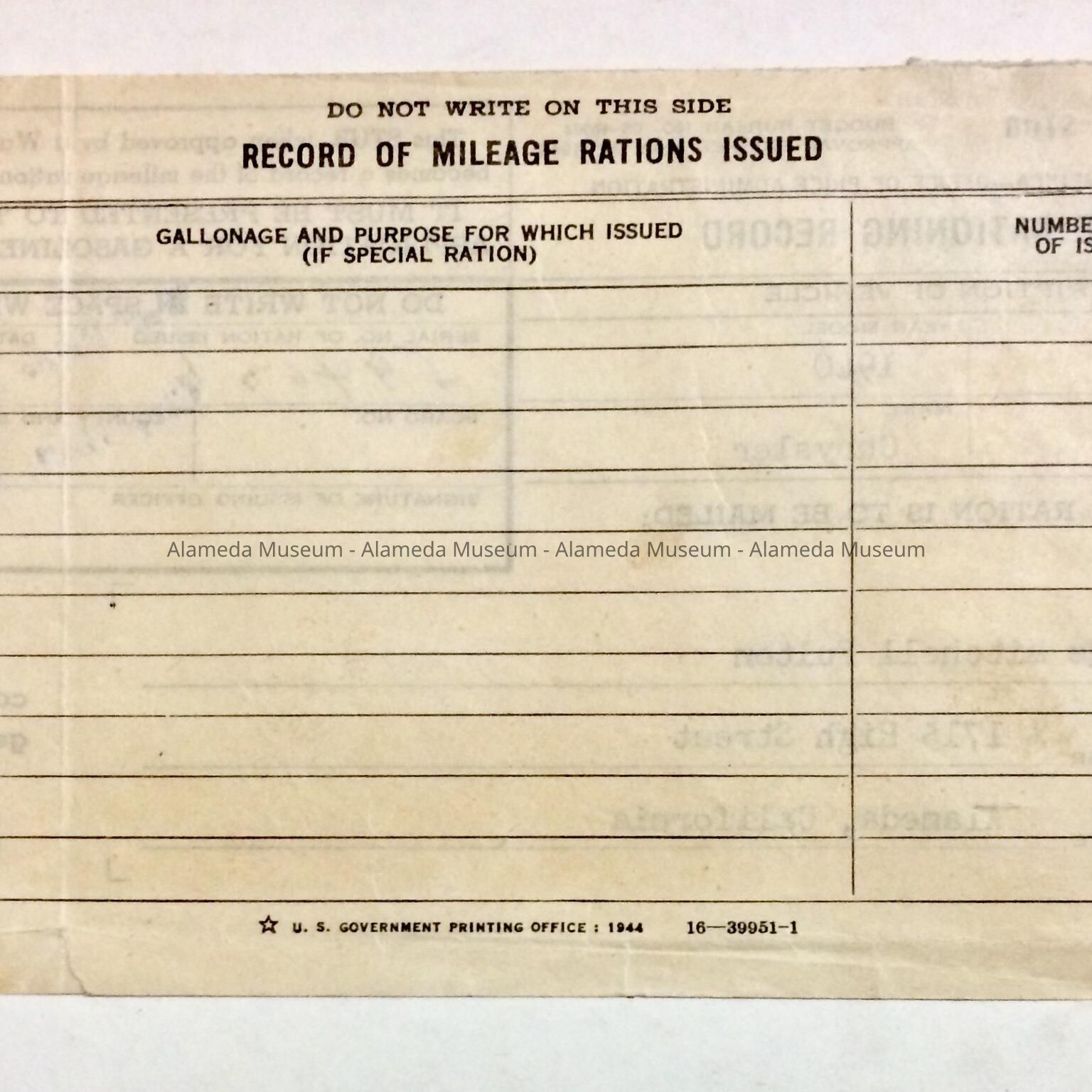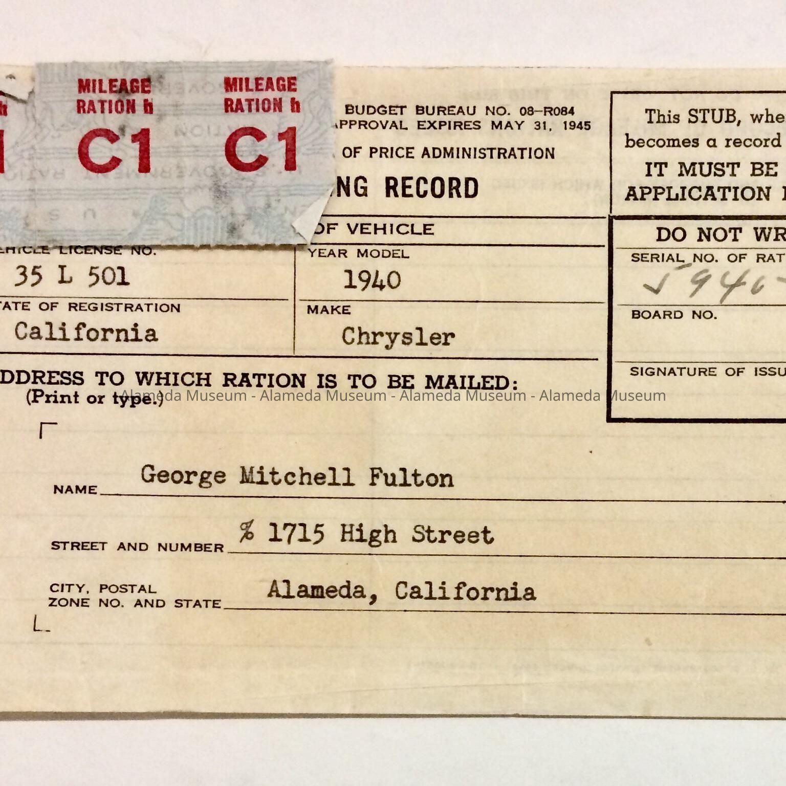 Description: One-page printed from No. R-534 issued by Office of Price Administration (blank form in which information has been inscribed by typewriter). Rubber stamped with "War Price and Rationing Permit, City Hall, Alameda, California. Attached to it are printed mileage ration stamps (three) with red type, stating "Mileage ration C1".