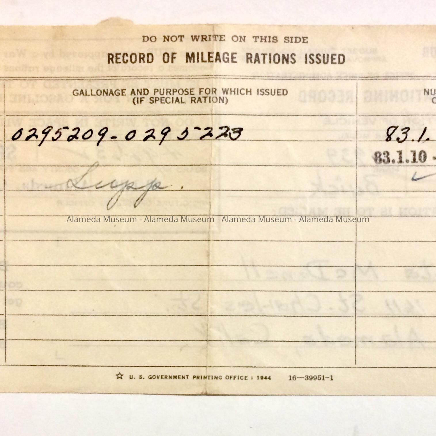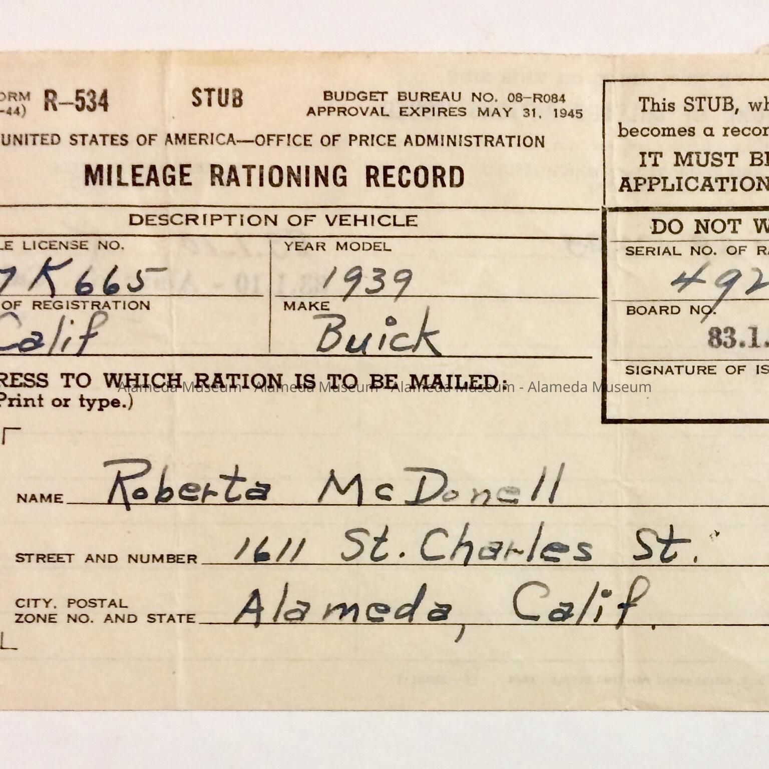 Mileage Rationing Record issued to Roberta McDonell, 1944Entry/Object ID