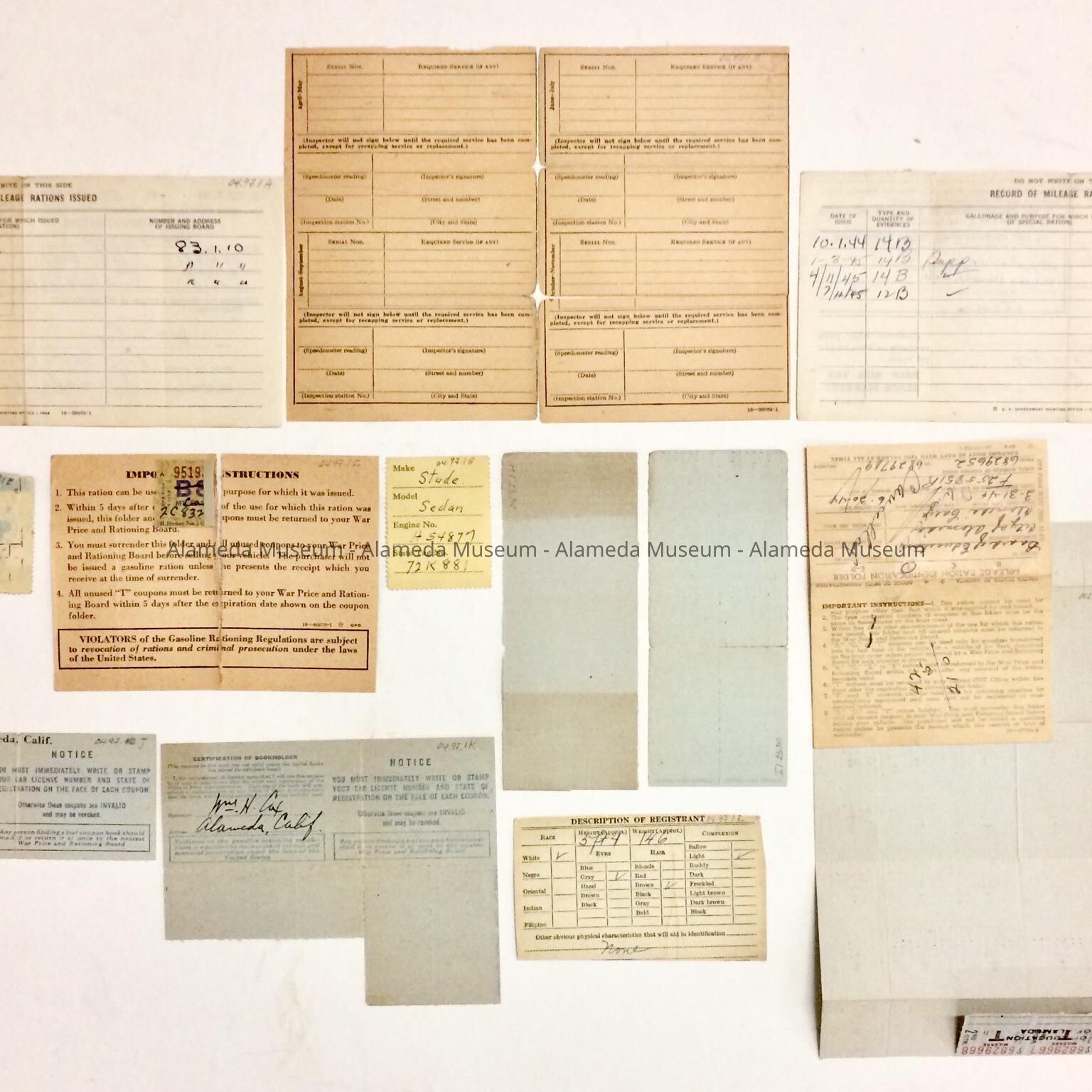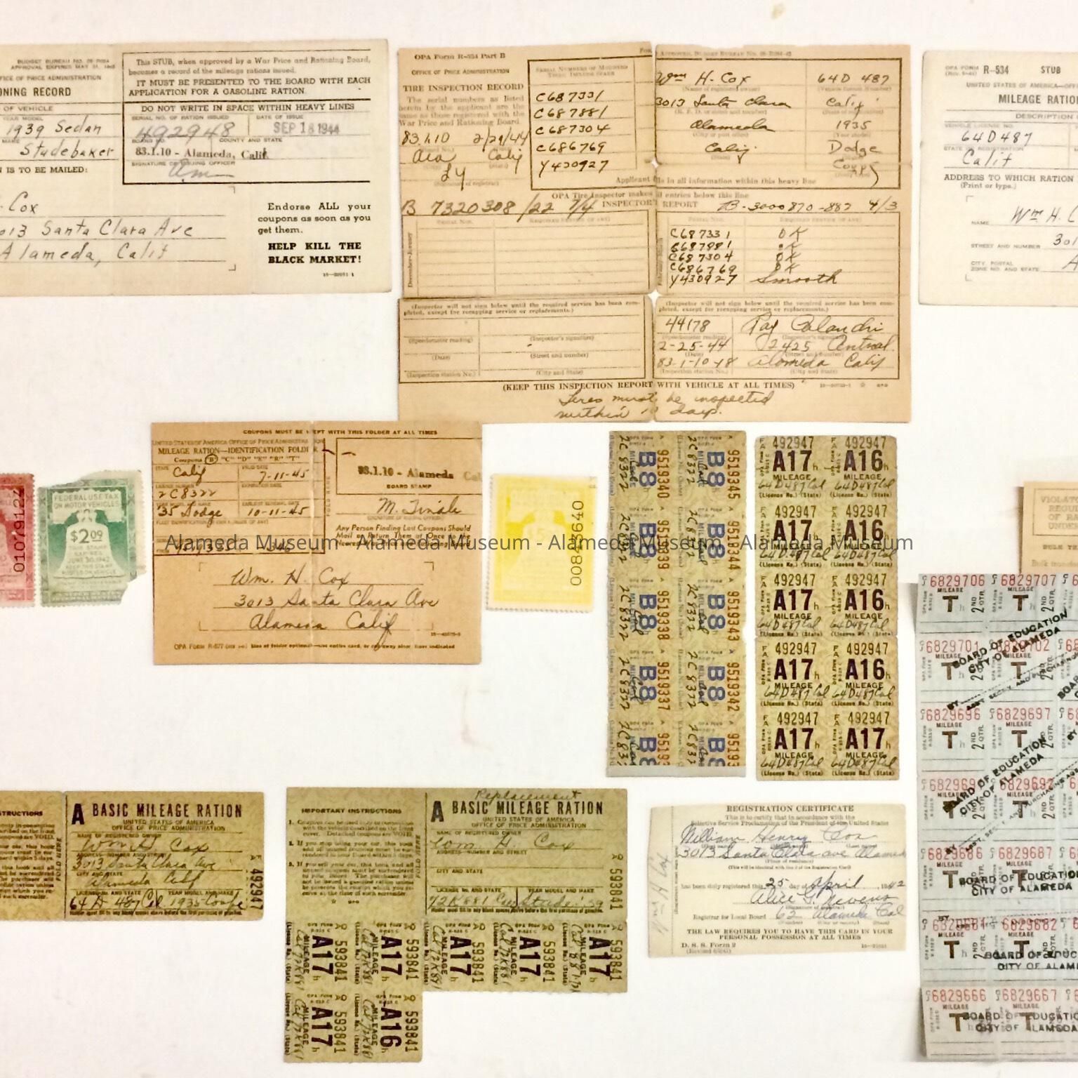 HISTORY OF OBJECTS: MILEAGE RATIONING RECORDS, STAMPS, ETC., ISSUED FOR THE VEHICLE OF WILLIAM H. COX, 3013 SANTA CLARA AVENUE, ALAMEDA. MR. COX WAS A RESIDENT OF ALAMEDA FOR MANY YEARS AND WAS THE HUSBAND OF THE LATE ADELINE TOY COX.