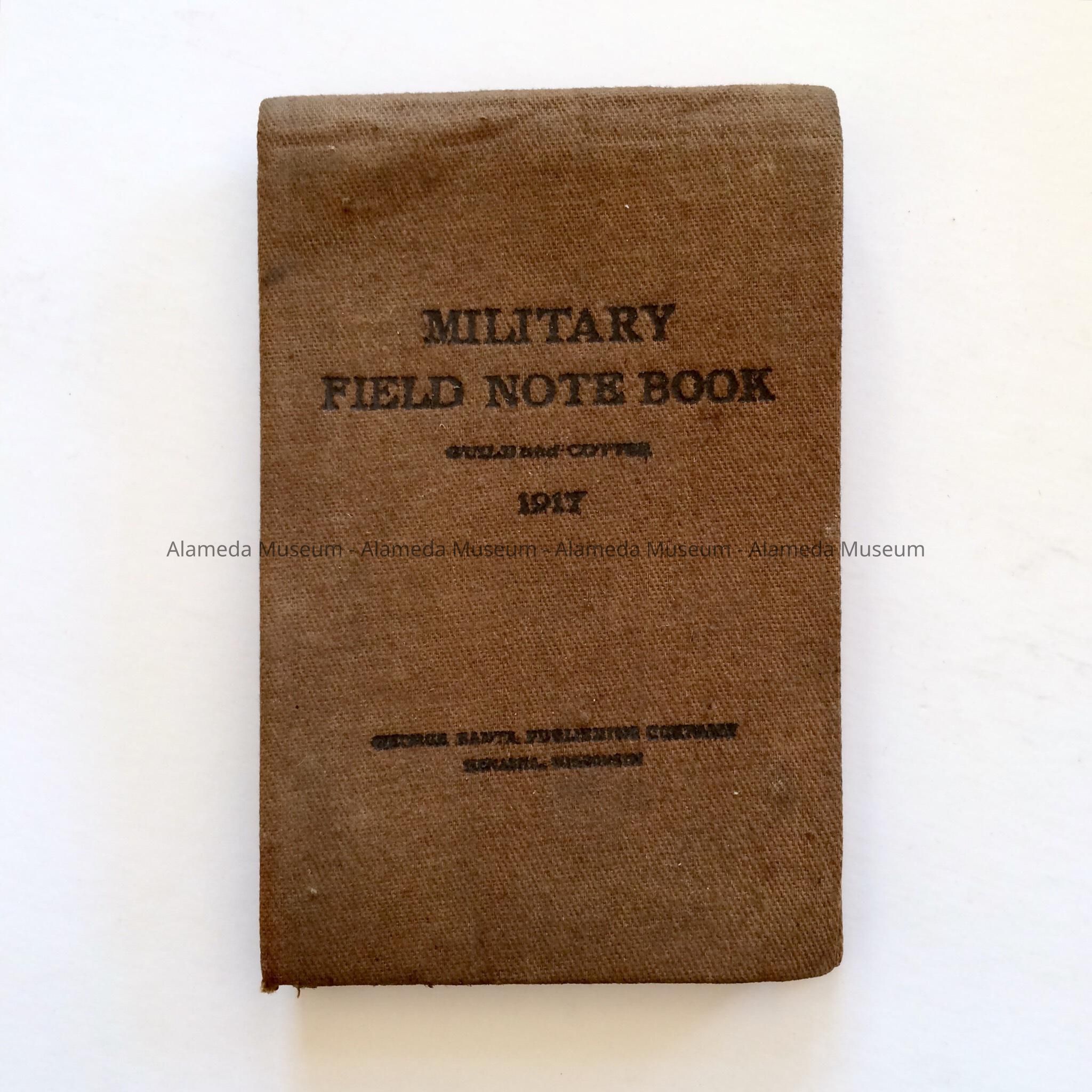 Description: notebook, with brown canvas cover, stating 'Military Field Note Book; Guild and Cotton, 1917, George Banta Publishing Company'. Main area for notes is unused, but penciled notes are under 'Notes of Permanent Record.