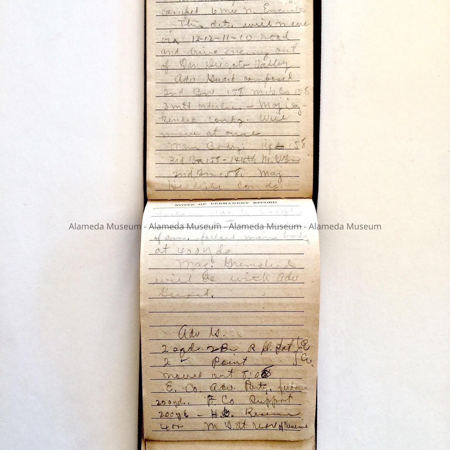 History of Object: Field Note Book of Charles Martin, second edition, issued for officers and enlisted men. The notes appear to relate to a campaign at Santa Fe Ranch, near San Diego. Camp Kearny, near San Diego, was a National Guard training camp.