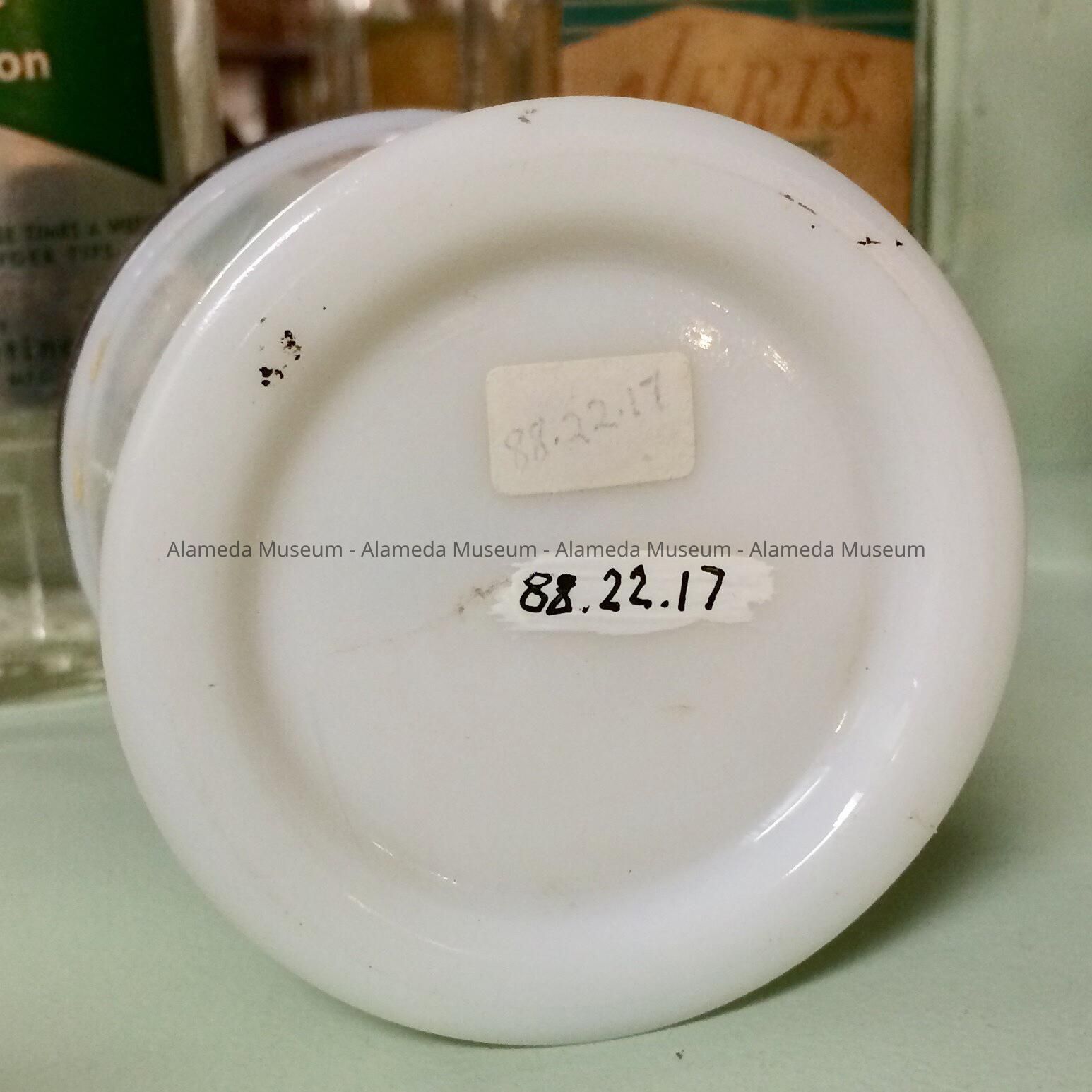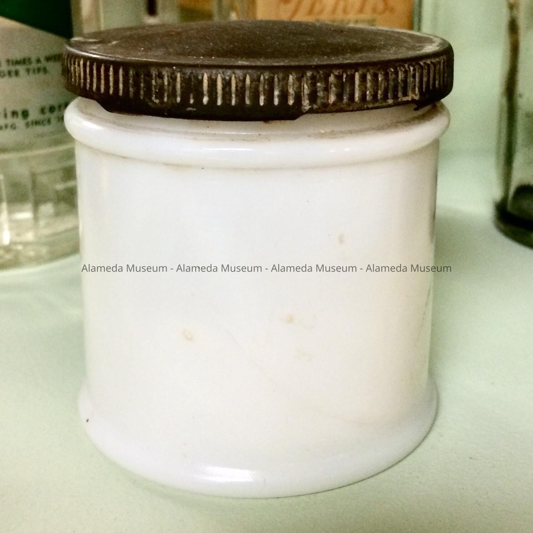 Milk glass jar with gold finish metal screw top from Frank's Barber ShopEntry/Object ID