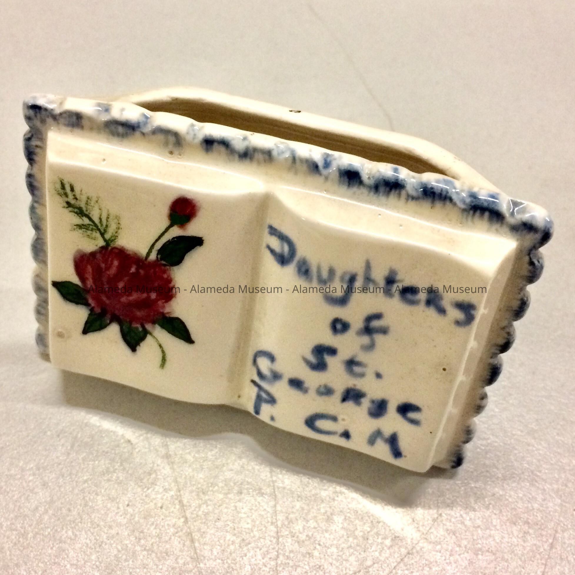 semi-porcelain vase in the shape of an open book, with a transfer image of a red rose an rosebud on one side, and hand-drawn text in blue 'Daughters of St. George P. C. M' on the other, and blue edging, added before glazing. Underside is marked 'G.A.B. '58'