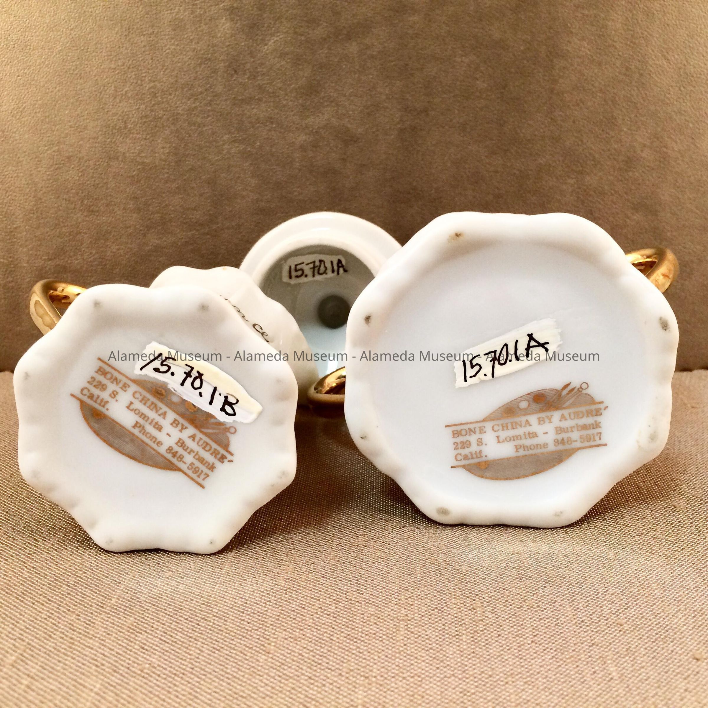 DESCRIPTION: PORCELAIN WHITE AND GOLD CREAMER AND SUGAR CONTAINER, BOTH PIECES ARE INSCRIBED, "ADELPHIAN CLUB OF ALAMEDA, 1896." THEY ARE SIGNED ON THE BOTTOM, "BONE CHINA BY AUDRE, BURBANK, CALIF."