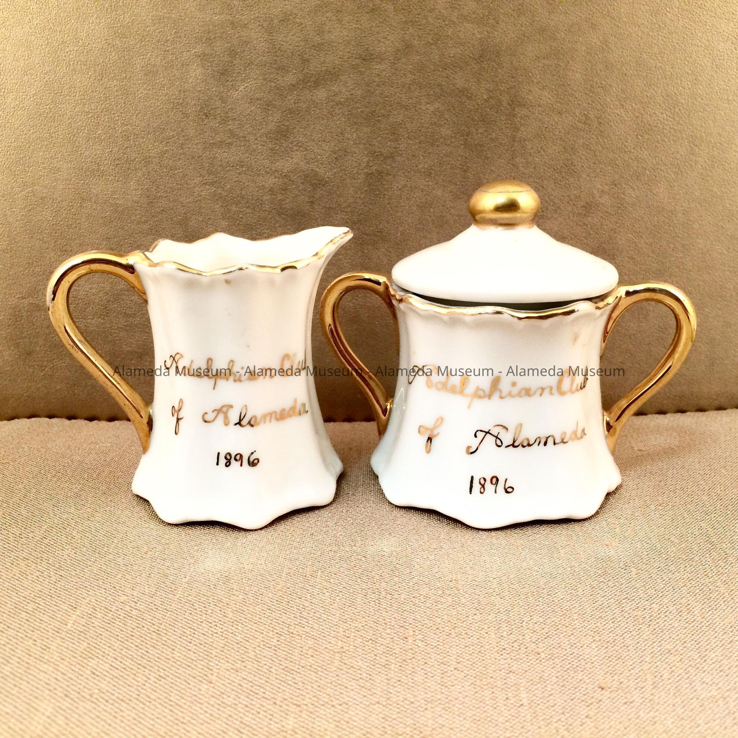 HISTORY OF OBJECTS: SOUVENIR MINIATURE CREAMER AND SUGAR CONTAINER COMMEMORATING THE FOUNDING OF THE ADELPHIAN CLUB IN 1896, ALAMEDA."