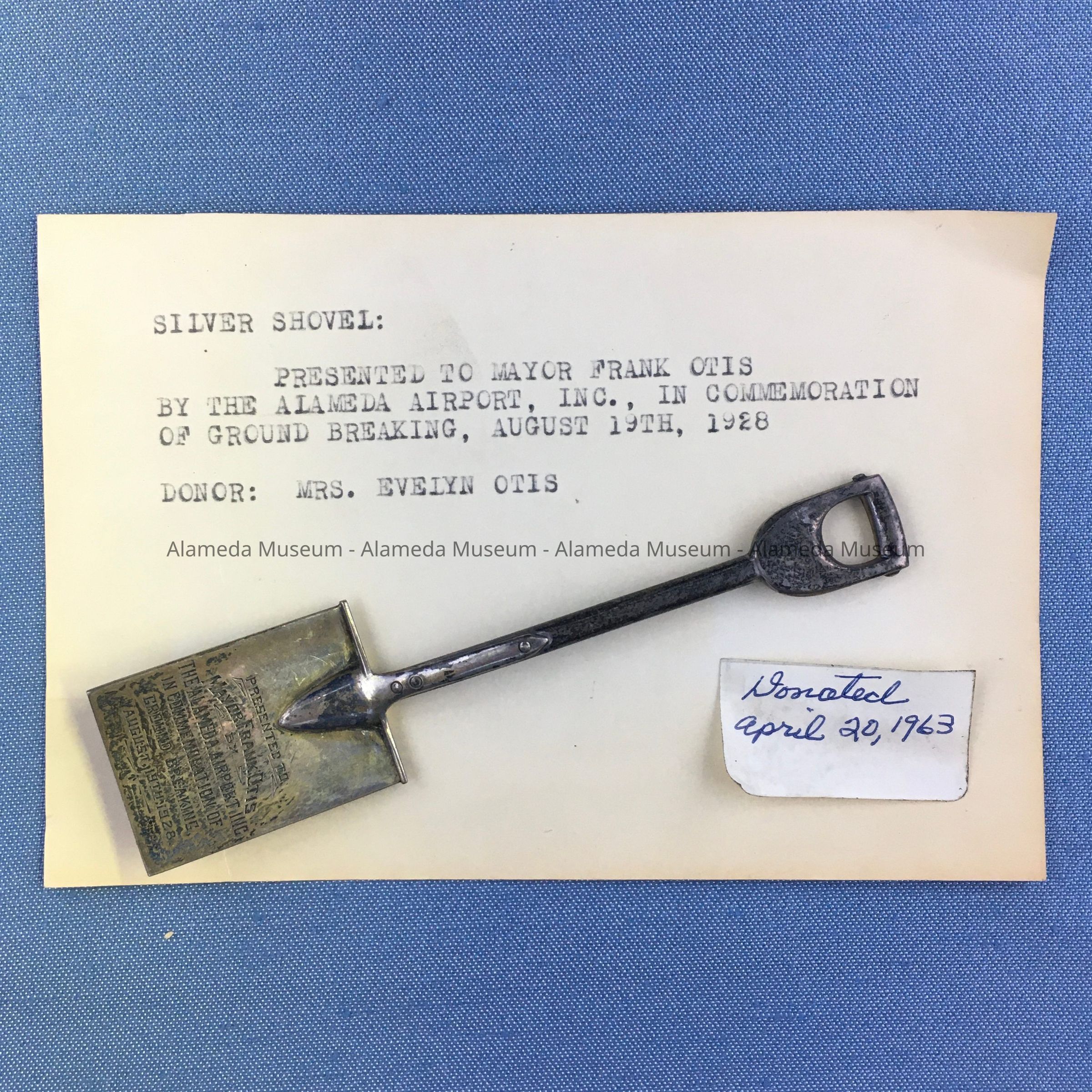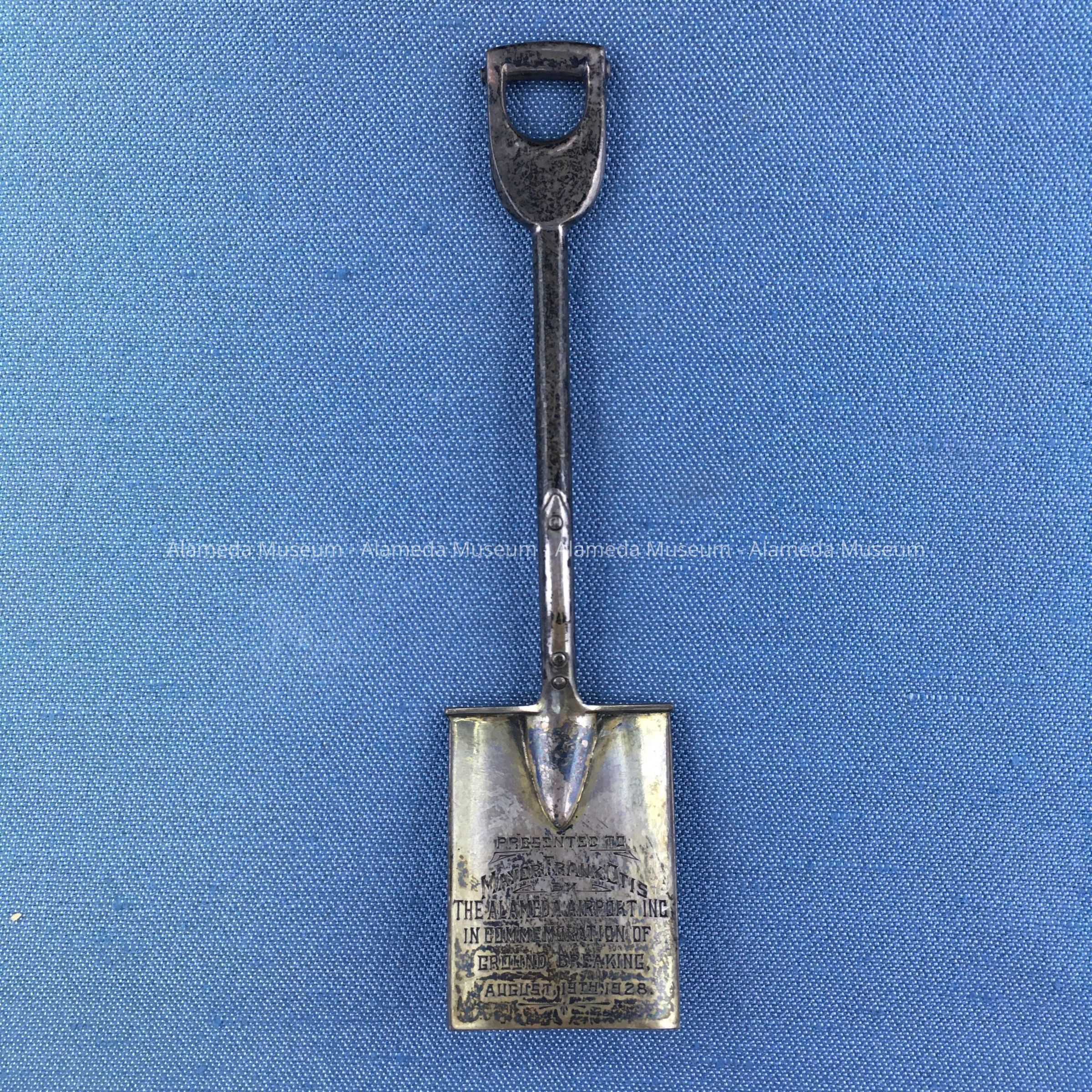 Description: silver miniature shovel, with text engraved on the blade (all in capital letters): 'Presented to:/Mayor Frank Otis/The Alameda Airport Inc./in Commemoration of/Ground Breaking,/August 19th, 1928.' Handle and grip have dark patina. No silver marks.