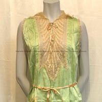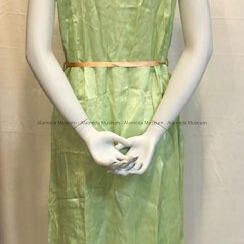 Description: mint-green satin sleeveless nightgown with scalloped hemline and a narrow band of gold-colored lace at hem and armholes, and elaborate gold lace inset at center front connecting to collar, which lace has pink and blue lace leaves. Lace-up ribbon closure with reversible salmon and mint-green silk ribbon; wider ribbon of the same style is pulled through two loops at the waist. Has a sewn-on pocket on the right side with similar lace and ribbon decorations, with a flower rosette with pink flower buds of unknown material.