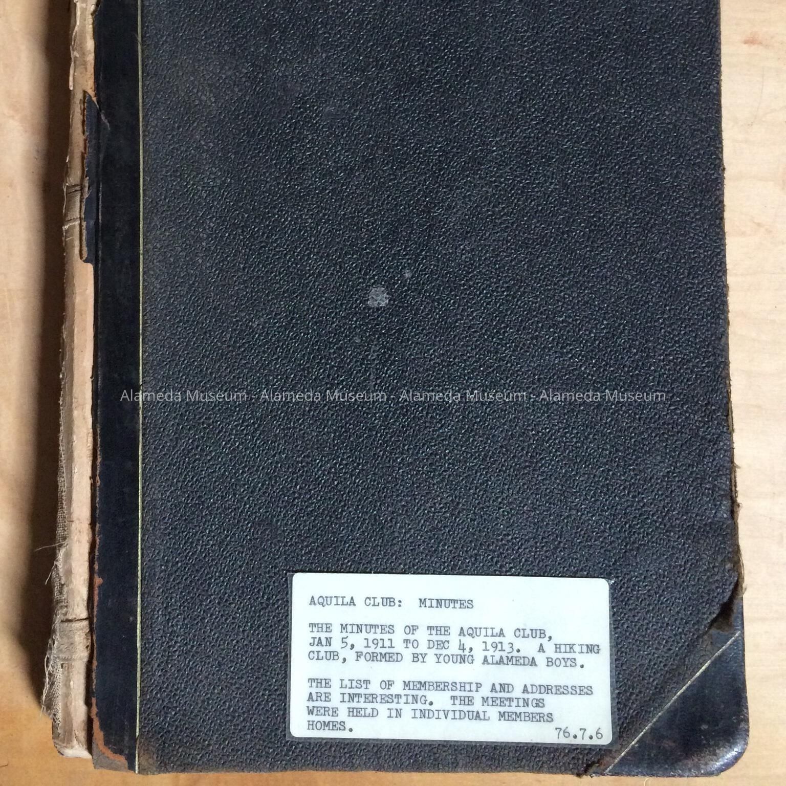 HISTORY OF OBJECT: THE MINUTES OF THE AQUILA CLUB, JAN 5, 1911 TO DEC 4, 1913, A HIKING CLUB. FORMED BY YOUNG ALAMEDA BOYS. THE LIST OF MEMBERSHIP AND ADDRESSES ARE INTERESTING. THE MEETINGS WERE HELD IN INDIVIDUAL MEMBERS’ HOMES.